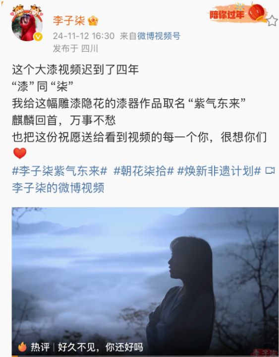 11月12日,知名博主李子柒发布两段新视频重返公众视野,迅速成为全网热议的焦点,相关话题“李子柒更新了”和“李子柒回归”等迅速占据了各大热搜榜单的首位.