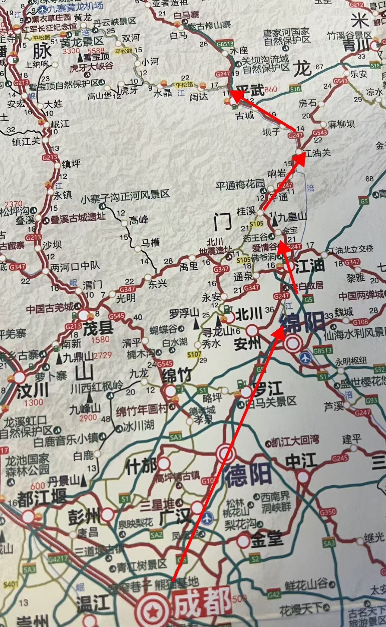 上午:从成都出发,沿成绵高速行驶,到达江油市。