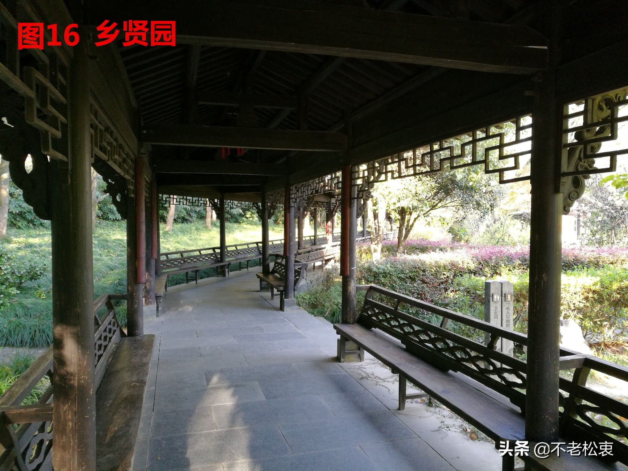 乡贤园位于江湾村景色宜人的后龙山脚下,由古代园林“后桃园”扩建而成,占地二十八亩,是为纪念江氏先贤所建,有苏州园林凤格(图16)。园内建有名人名树观赏区、进思舫、观鱼台、历代名人石雕群、汇贤湖、文笔塔和仰山茶社,种植各类名贵花草树木四十余种。