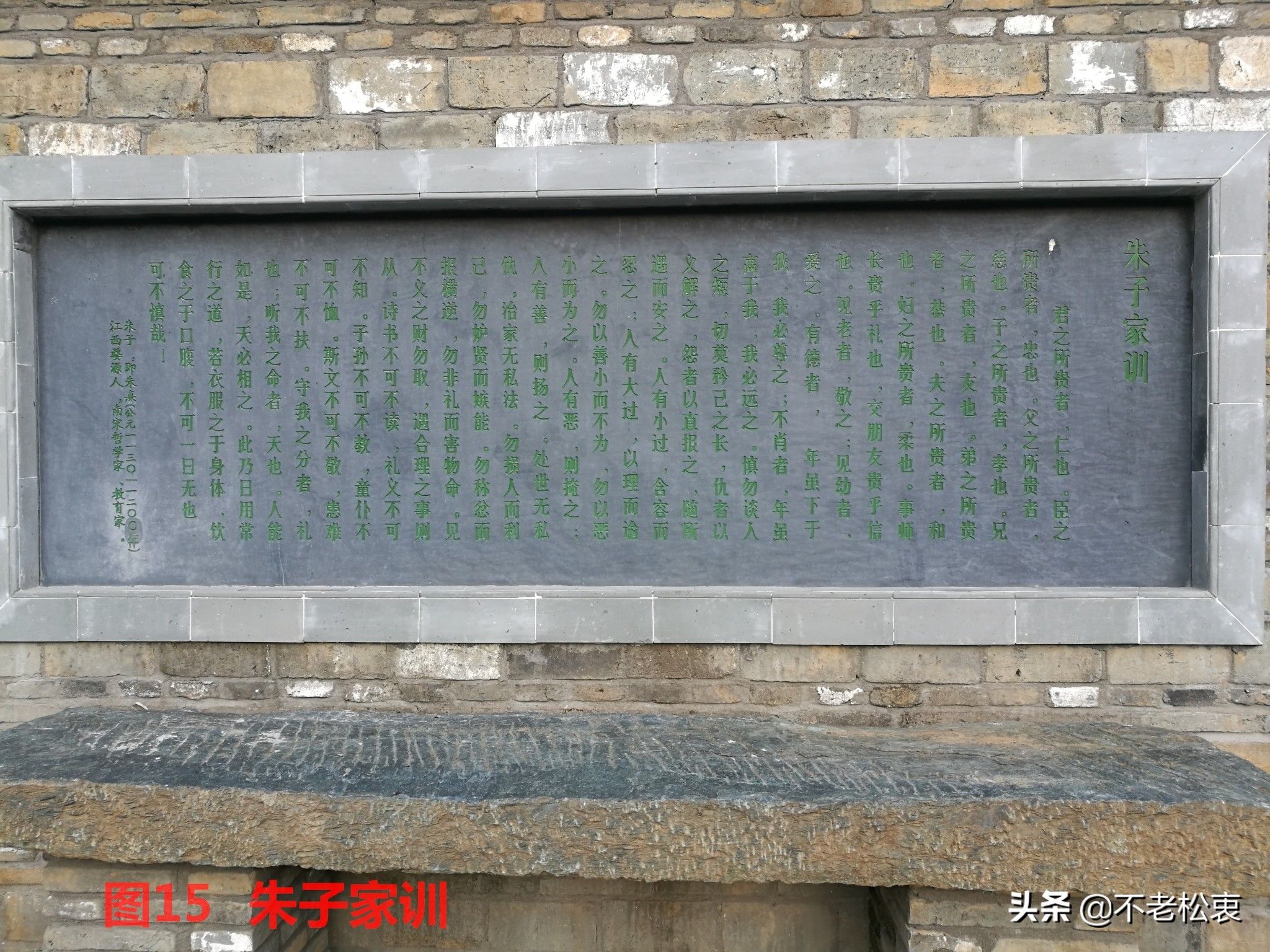 小学门外的休闲小广场上有一石碑,上刻有“朱子家训”(图15)。朱子即朱熹(1130-1200)。其中“匆以善小而不为,勿以恶小而为之。”“勿损人而利己,勿妒贤而嫉能。”“见不义之财勿取,遇合理之事则从。诗书不可不读,礼义不可不知。”“斯文不可不敬,患难不可不扶。”……都是做人的基本道理。如果人人遵循,社会就是一个和谐温暖的社会。