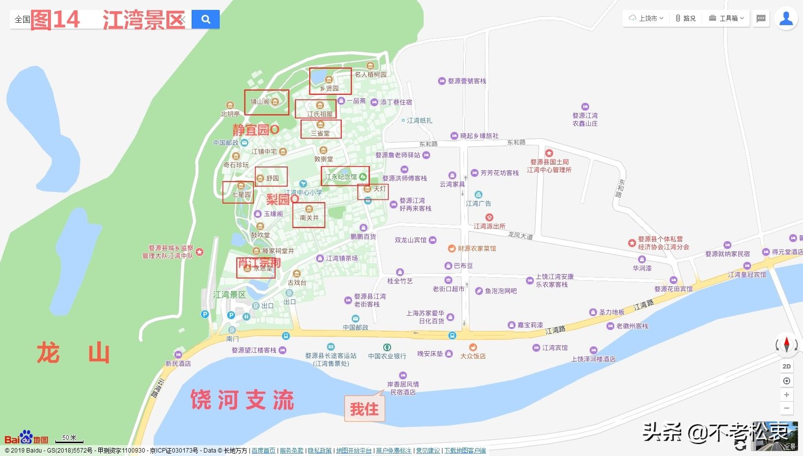 江湾景区比李坑景区更胜一筹。江湾景区依山傍水,躺卧龙山怀、畅饮饶江水。景区内景点众多,而且各具特色;共同特点是布满古人诗词、门前有清水流淌。可以按地图反时钟方向依次参观(图14)。