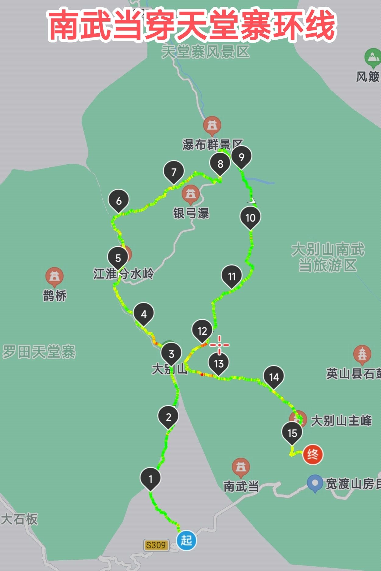 2.【交通】从武汉开车3个小时能到,导航“大别山南武当旅游区”就到了武圣宫,导航“英山大别山主峰索道”就到了徒步登山口或是索道站,武圣宫和索道站相距2公里。附近还有个“龙潭河谷”,号称华中第一谷,喜欢玩水的可以逛一逛。