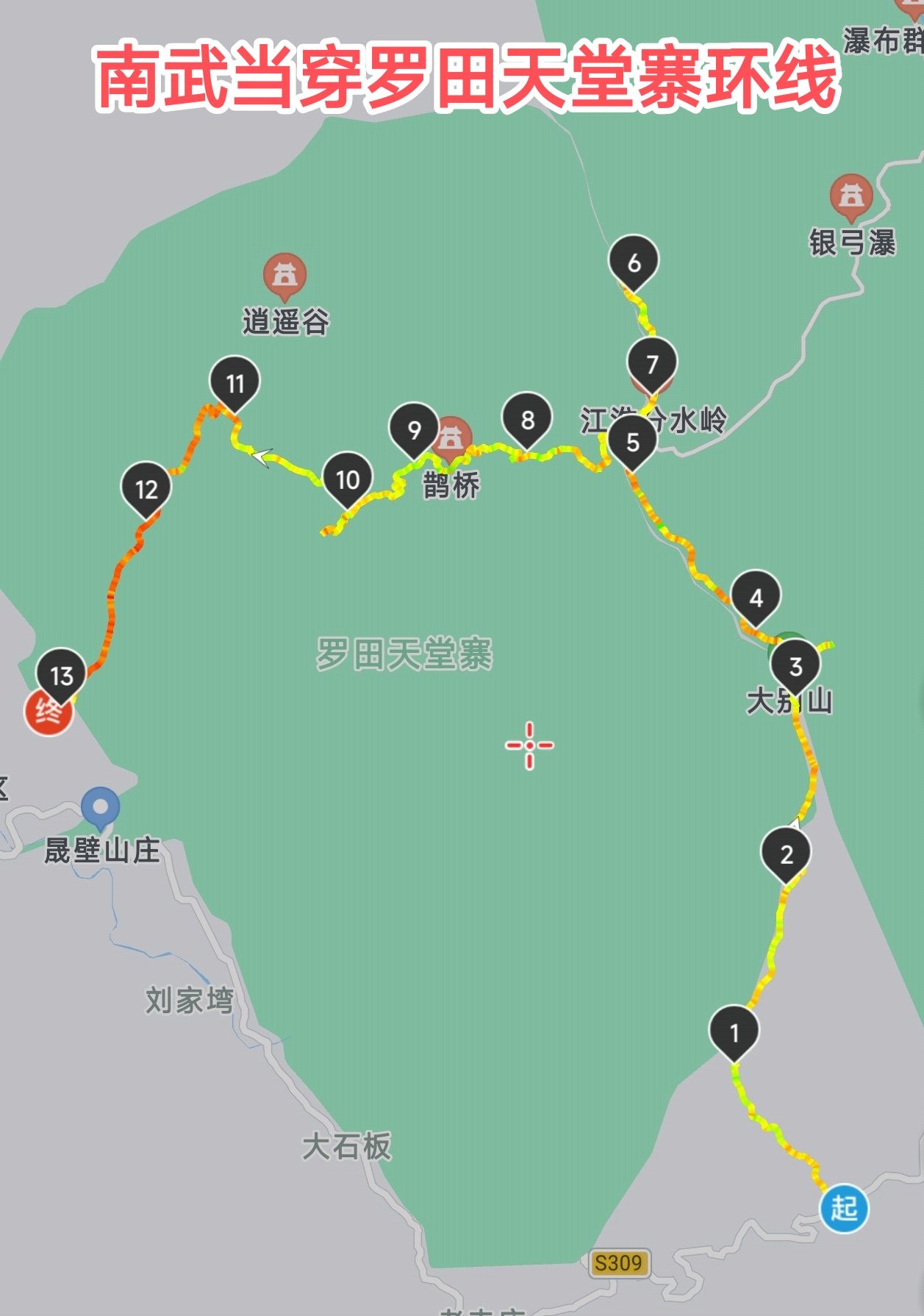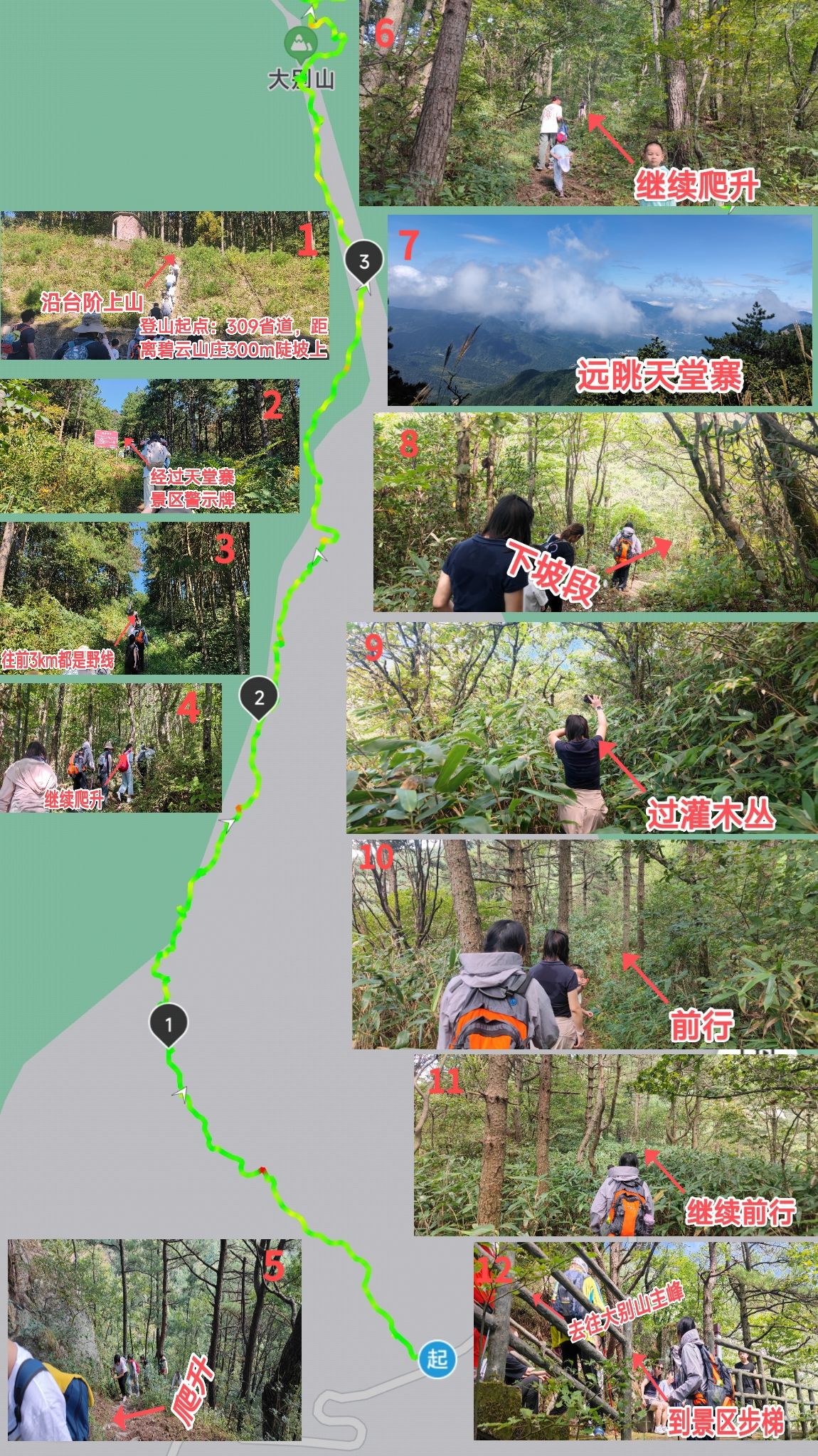 起点至3km:徒步起点在309省道距离碧云山庄300m的陡坡上,沿着左边台阶上山,前3km纯野路且无岔路,一路爬升再下坡然后再爬升到达景区步梯。