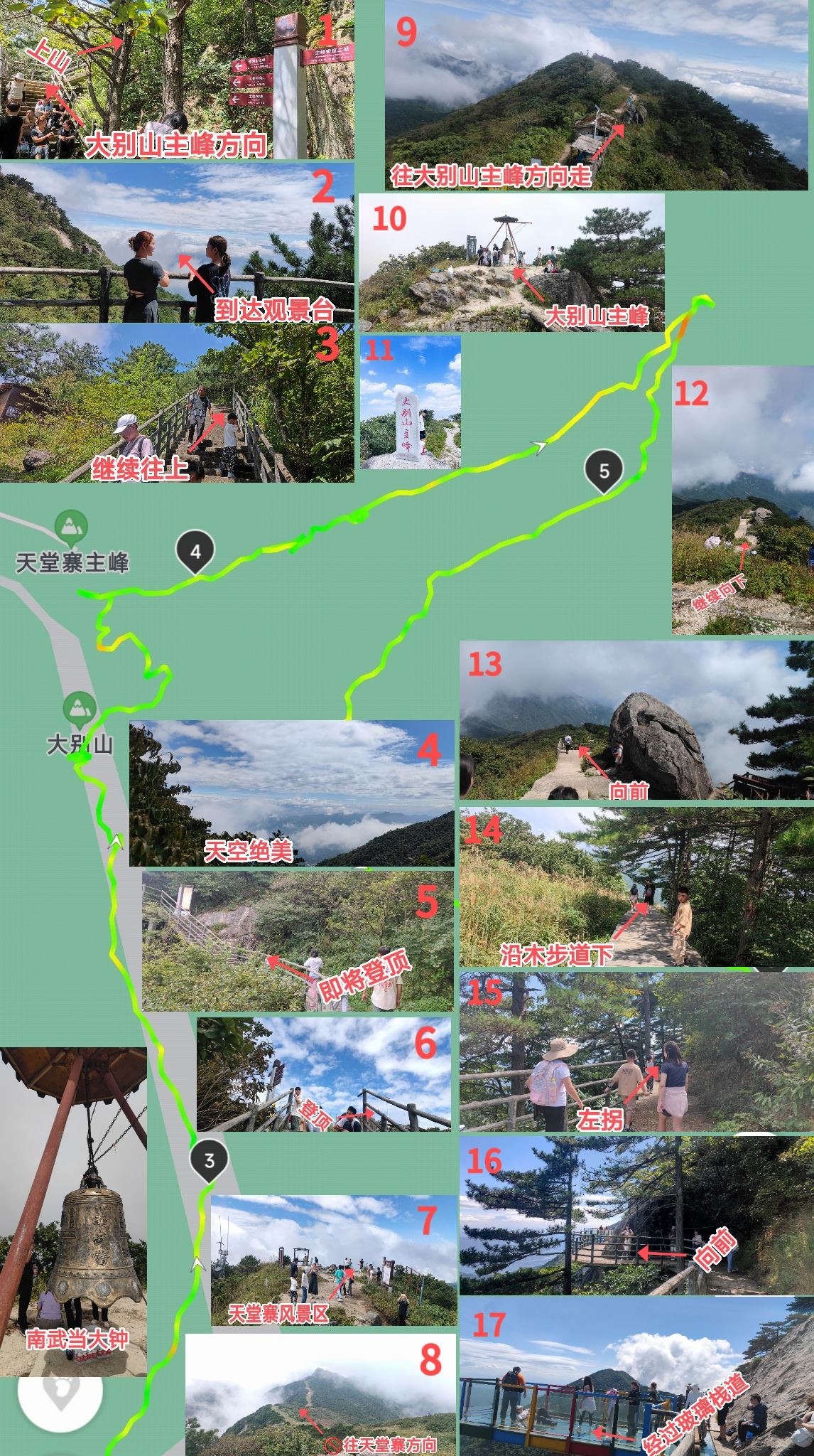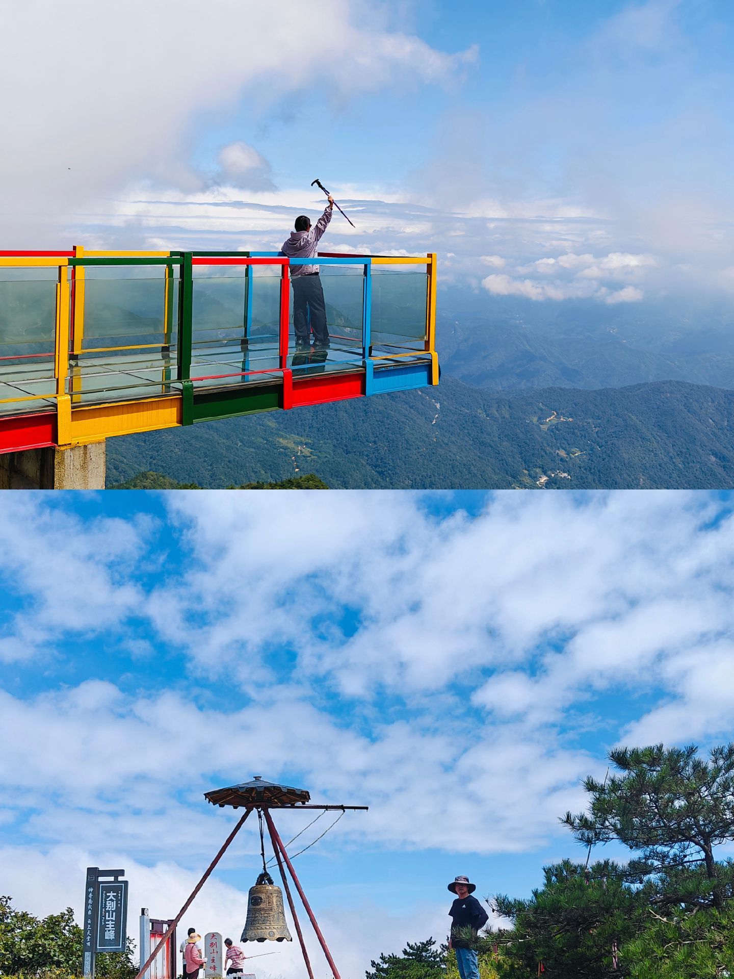 3km至5km处:到达景区步梯后往左上大别山主峰,主峰通往天堂寨景区。登临大别山主峰,感受一脚跨两省的壮观美景。登顶后不要往左去往天堂寨风景区,我们往右经过南武当大钟,然后沿着步道下山到玻璃观景台。
