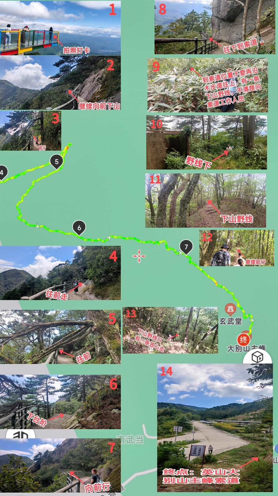 5km至终点:玻璃观景台拍照打卡完成后,沿步道下山到南武当下山索道处,索道左边为下山野线,和上山野线一样也是全程无岔路,只是下山坡度较陡,更具挑战性。下山便可抵达终点:英山大别山主峰索道。