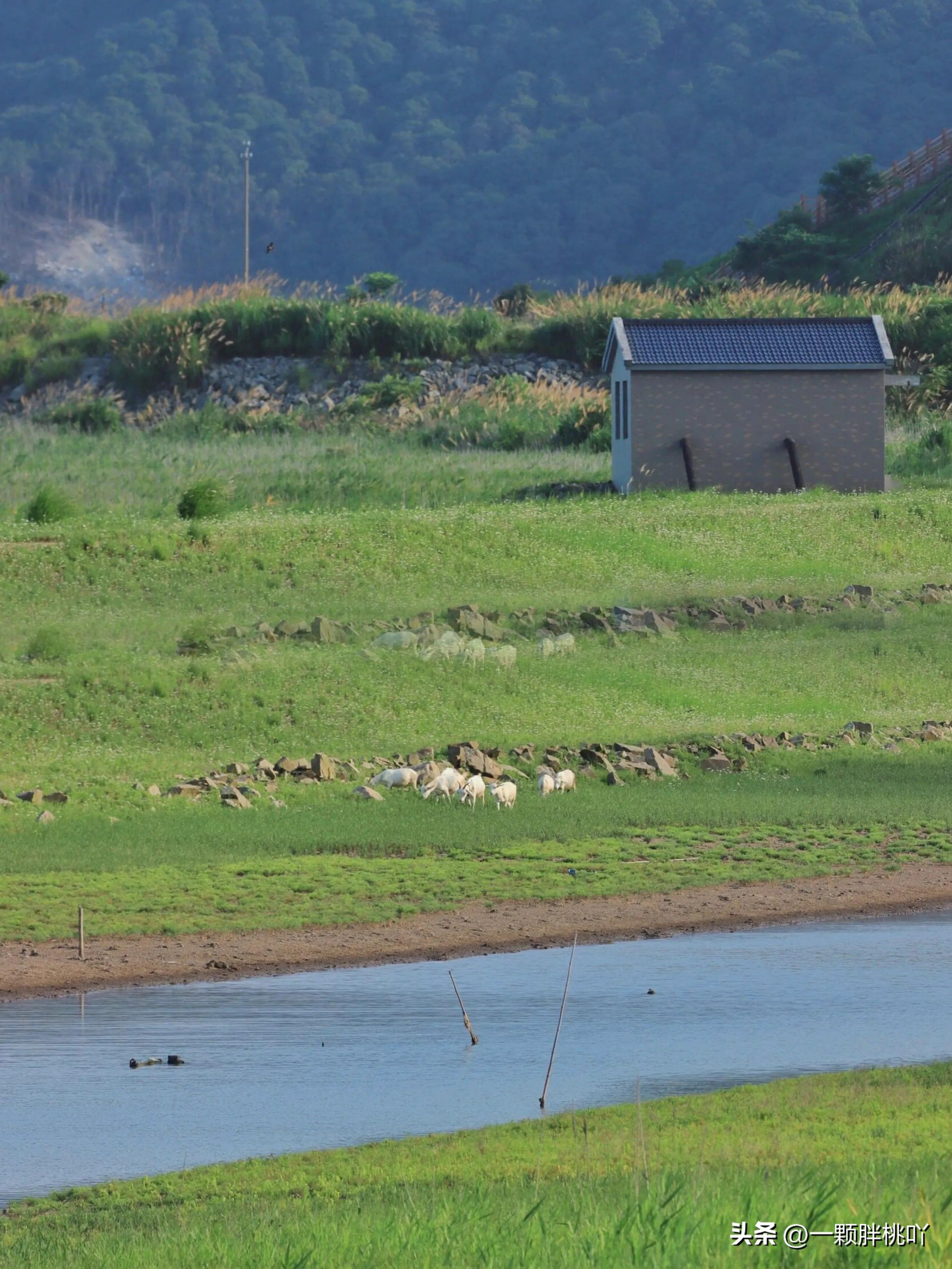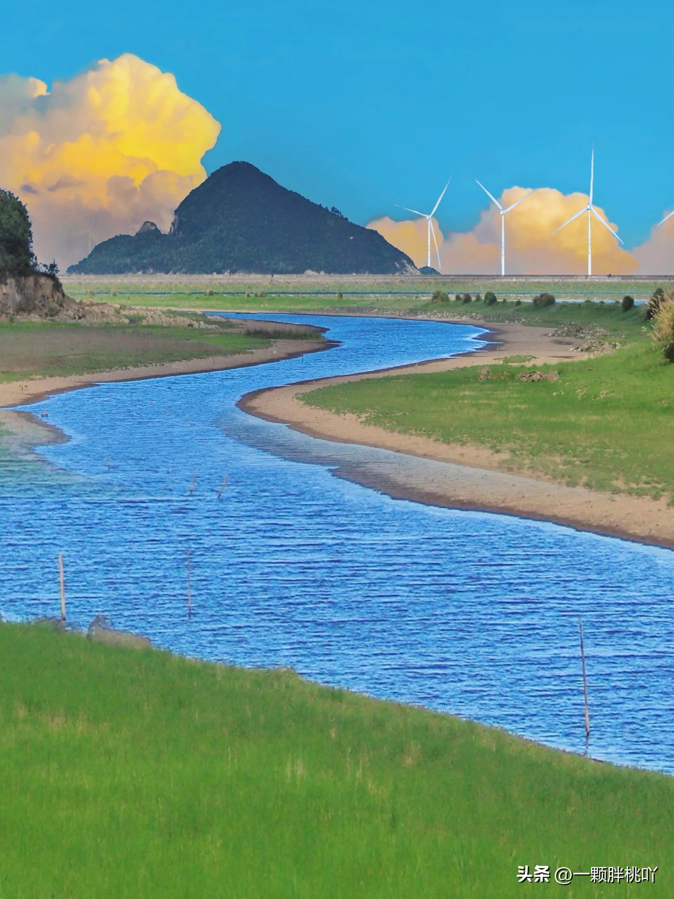 傍晚时间一边是草坡上吃草的牛羊,一边是蔚蓝色的大海和风车!