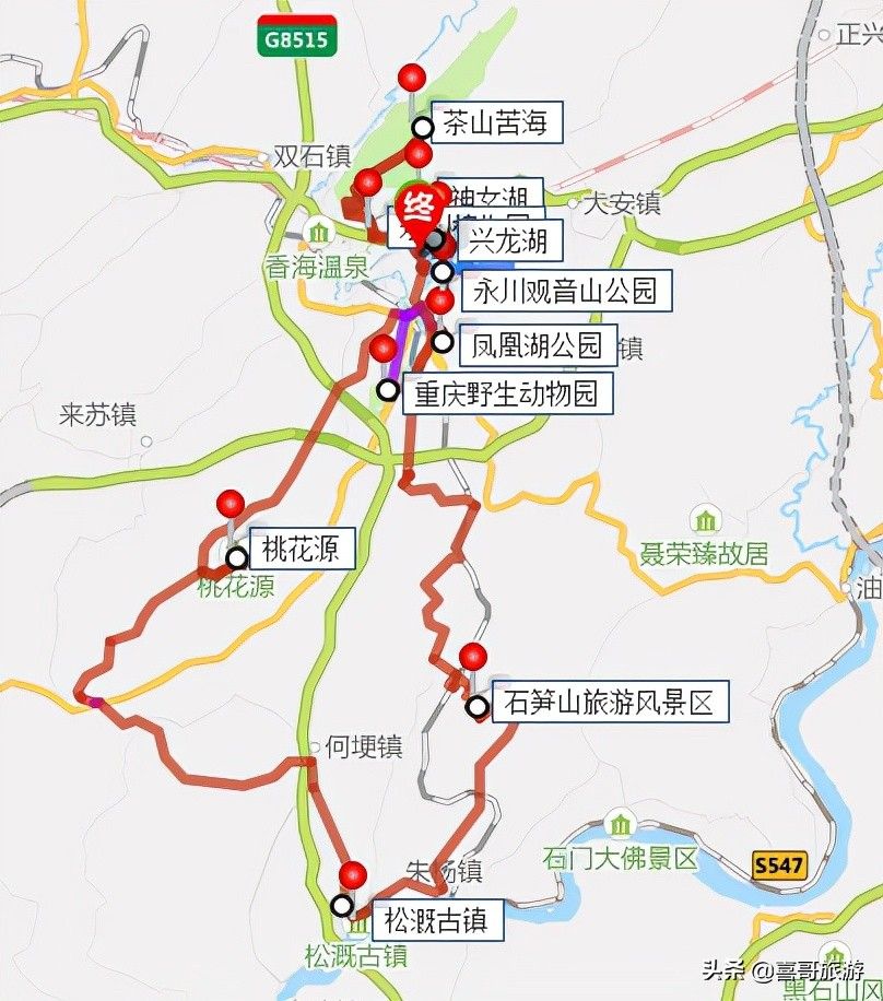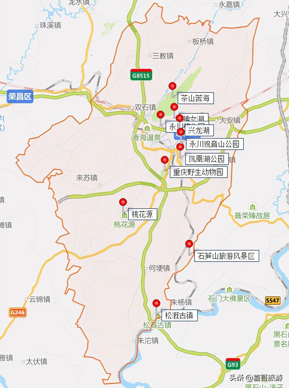 2、重庆永川区十大景点自驾游行程路线:重庆永川区-永川植物园-茶山竹海-神女湖-兴龙湖-永川观音山公园-凤凰湖公园-重庆野生动物世界-石笋山旅游风景区-松溉古镇-重庆永川桃花源-重庆永川区。