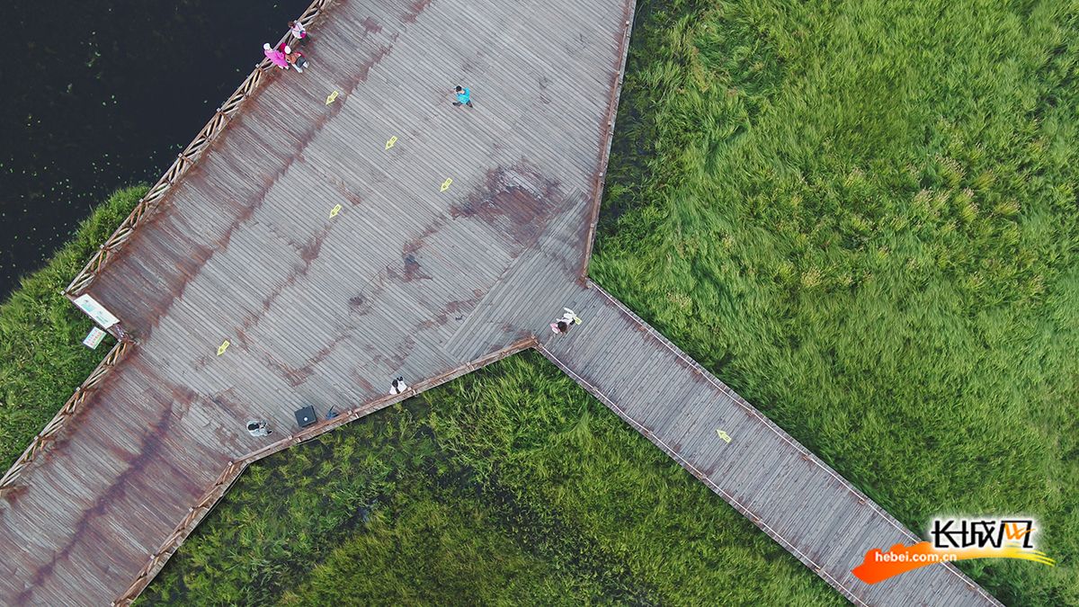 俯瞰七星湖湿地公园的木栈道。
