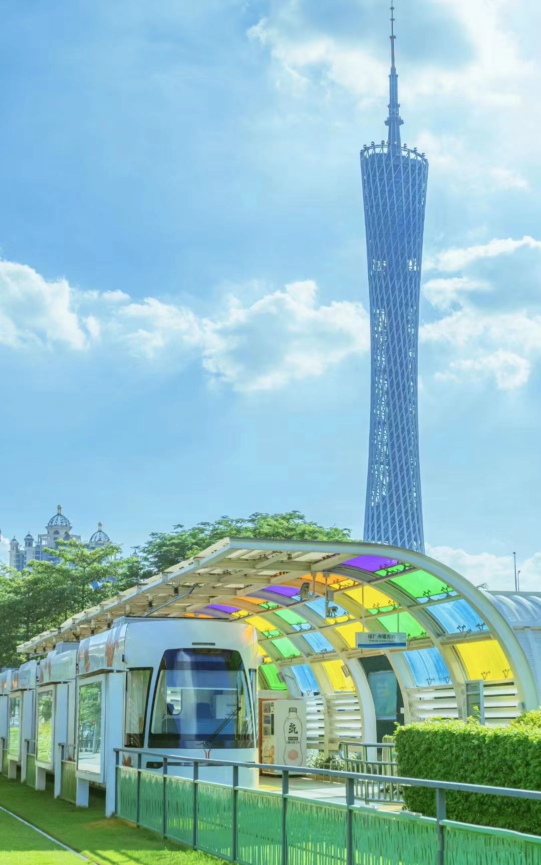 海心桥下来后,你就可以乘坐珠江边的有轨电车。这是起点站,可以选择坐电车去琶醍。如果想要上广州塔,也可以在塔底下买票。