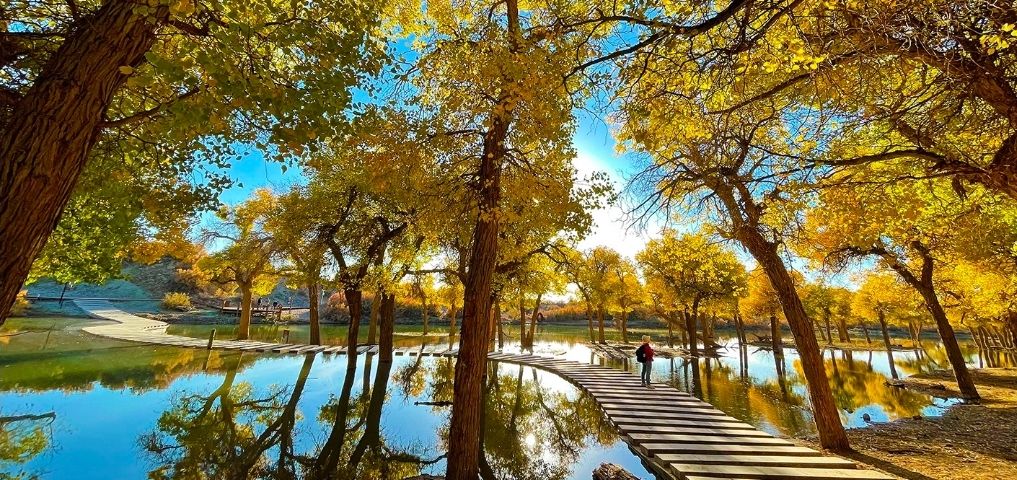 大漠胡杨旅游区是国家4A 级景区。在这里,繁花似锦的大漠田园,生动再现了戍边屯田时期的繁华盛景,让人仿佛穿越时空,目睹昔日的辉煌;烟波浩渺的水境胡杨,如梦如幻,不似在人间却胜似仙境,那绝美的景色令人心醉神迷;金龙游曳的弱水河畔,朝起朝落之时,犹如仙绫缥缈于九天之上,美轮美奂;逶迤连绵的沙漠驿站,驼铃悠悠,孤烟落日圆的景象充满了诗意与沧桑;三千妖娆妩媚的红柳湾,一年之中三次变幻,绚烂绽放着生命之花,展现出大自然顽强的生命力;铺青叠翠的芨芨草胡杨林,琪花瑶草之间羊群悠然自得,构成了一幅宁静而美好的田园画卷。