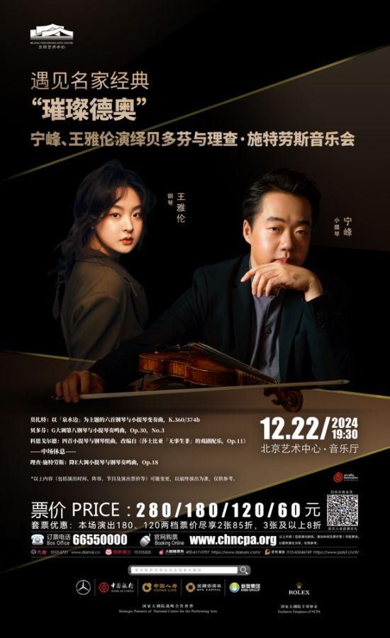本场音乐会将由小提琴家宁峰与钢琴家王雅伦携手演绎。音乐会以莫扎特“我失去爱人”为主题的六首钢琴与小提琴变奏曲拉开序幕,作品以其优雅和灵动展现了作曲家非凡的旋律天赋。贝多芬的G大调第八钢琴与小提琴奏鸣曲是一部充满活力的作品,充分体现了贝多芬的情感深度与音乐张力。中场前的最后一部作品为改编自莎翁《无事生非》戏剧配乐的四首组曲,它将带您穿越至文艺复兴时期的文化盛景。下半场,音乐会将以理查·施特劳斯的降E大调小提琴与钢琴奏鸣曲,一展浪漫主义晚期的风采,两位艺术家将用他们精湛的技艺诠释这些经典之作,期待您的聆听。