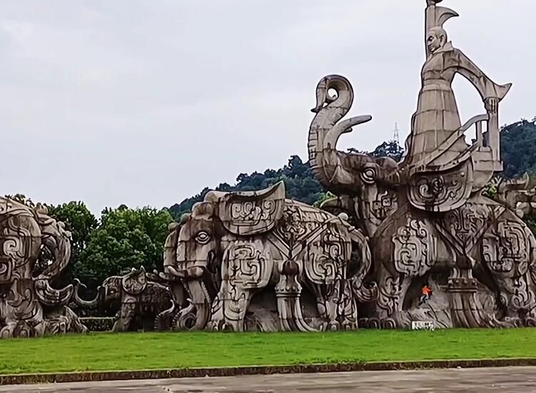 这是国内最长的城雕,也是世界上最大的大象城雕。这一巨雕用了1万余吨花岗岩毛石,这些毛石分成1251块,在河北制作后,大象石块用51辆30吨大卡车才运完。其体量之大,气势之恢宏,堪称亚洲第一。在大象群雕背后的山坡截面上,还有一块按山岩截面而立的巨型浮雕石壁,与象雕构图相一致,浮雕造型古朴,线条流畅。浮雕表现的是大舜以孝为先,德政为民的故事。
