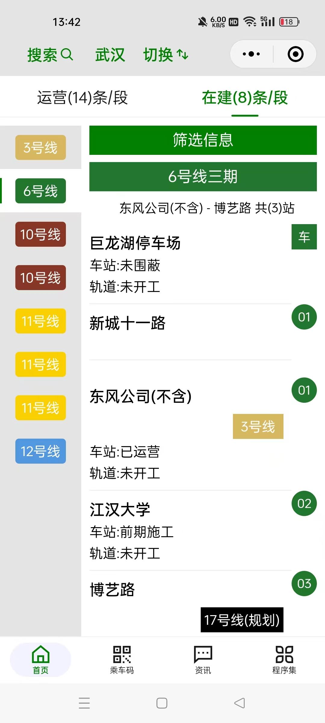 6号线三期(东风公司-博艺路),计划开通时间:待定。3座地下车站中,1座已开通,1座土建施工,其中1座围护结构施工,1座前期准备,其中1座前期施工;6个轨行区间中,6个前期准备。巨龙湖停车场未围蔽。