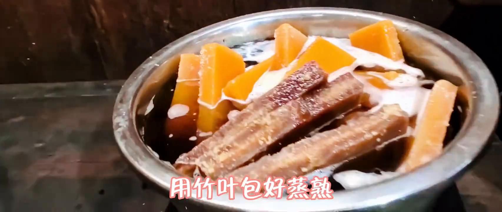 黄水粑需要将泡好的糯米蒸成糯米饭,加上豆浆和红糖,用竹叶包好蒸熟,有豆香味。他们世世代代都是做这个的。再看一下,这是大姐拿给我的黄水粑,拆一下这个看是什么样子的。平时做好的都是冷的是吧?这是蒸出来的,不沾水的是吧?对,有粽叶的香味,又香又甜。这么小小的。