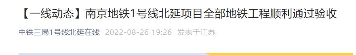 8月26日,中铁三局发文,承揽的一号线北延全部地铁工程均已顺利完成验收;