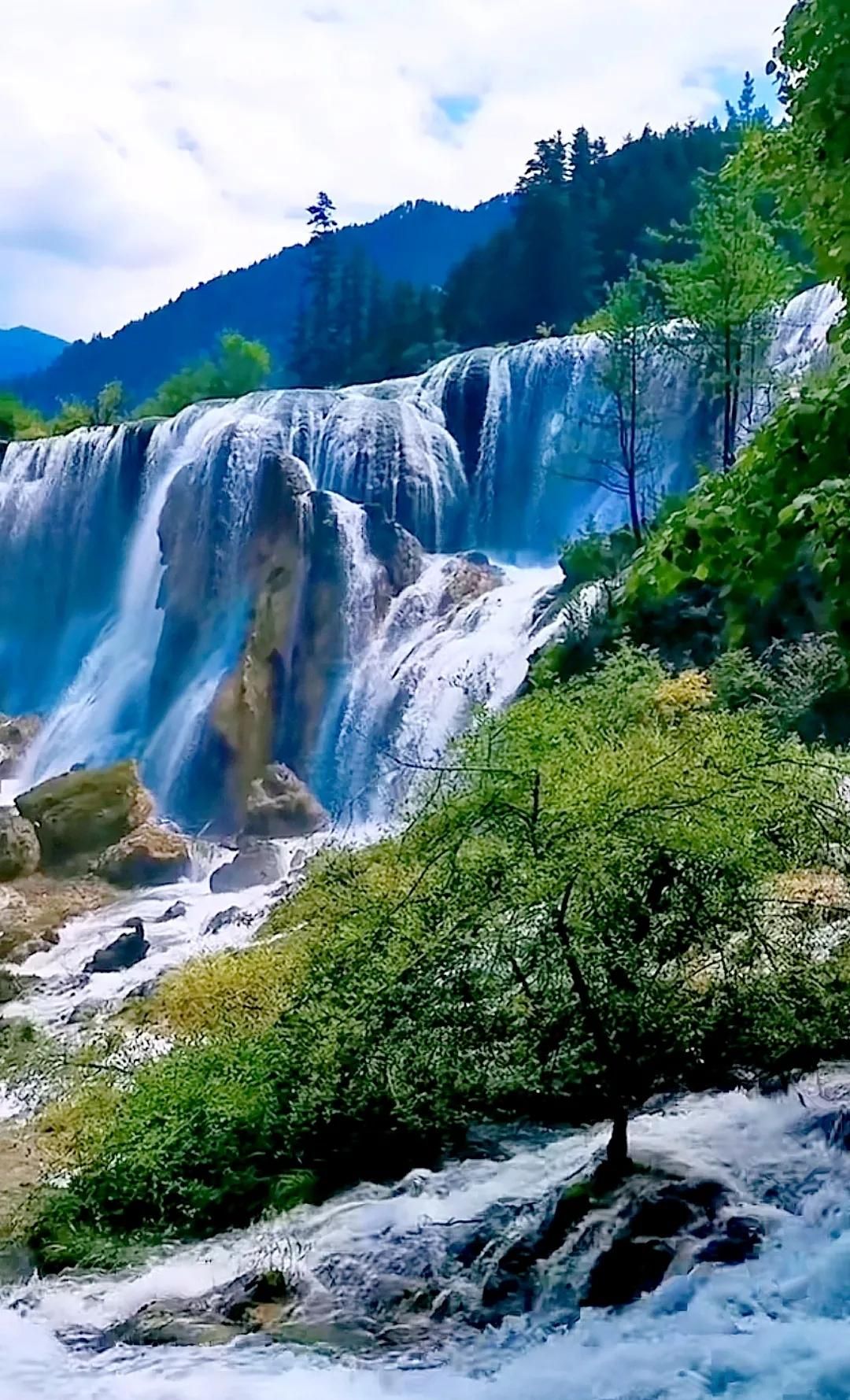 7、珍珠滩:这是九寨沟中景色最美的地方之一,滩上坡度平缓,在阳光的照射下,流水的表面如雾蚀般形成珍珠滩幔,景色非常迷人。