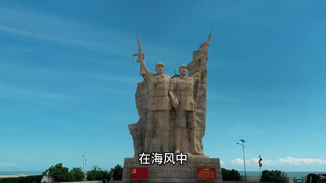 在海风中,一座热血丰碑纪念雕像造型宏大,气势磅礴,生动再现了当年解放军渡海英勇作战的英雄画卷,令人肃然起敬。园内纪念碑身呈船形屹立,乘风破浪,永驻向前,表现出解放军所向披靡,战无不胜的英雄气概。