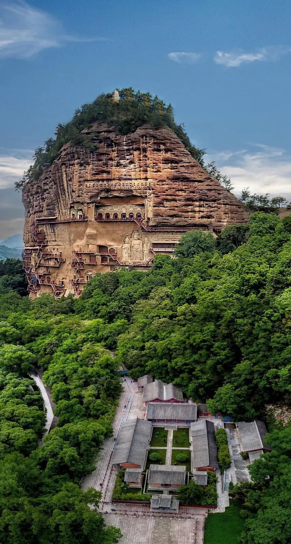 麦积山石窟因山形似农家麦垛而得名,始建于后秦时期,历经1600余年的开凿和修缮,现存窟龛221个,10632 身佛像,1300 余平方米壁画。麦积山石窟是中国“四大石窟”之一,有“东方雕塑陈列馆”的美誉,它也是唯一建在悬崖上的皇家石窟。