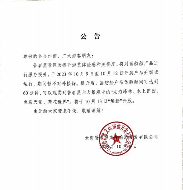 为提升游览体验感和美誉度,将对画舫船产品进行服务提升,于2023年10月9日至10月12日开展产品升级试运行,期间暂不对外接待。提升后,画舫船产品体验时间可达到60分钟,可以观赏到普者黑六大景观中的“湖泊峰林、水上田园、鱼鸟天堂、荷花世界”。将于10月13日“焕新”开放。