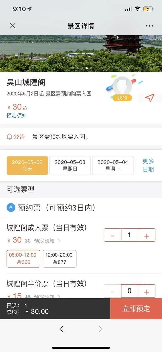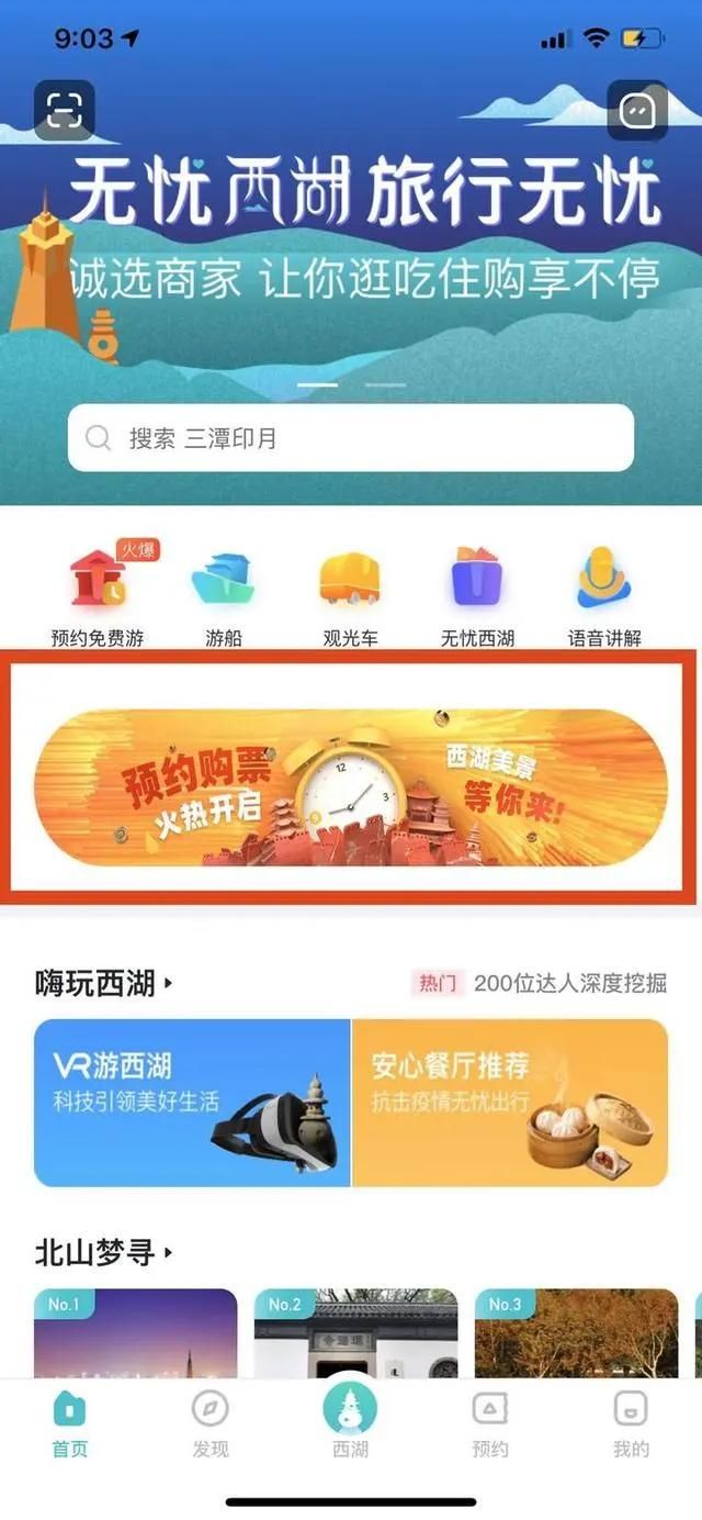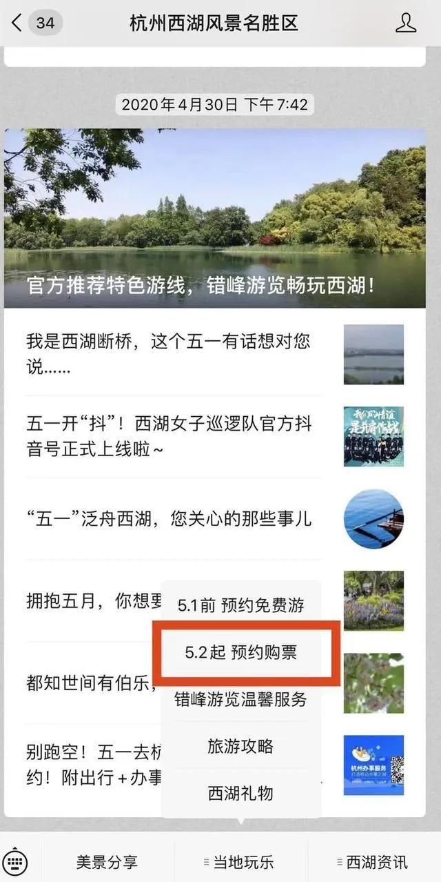 市民游客可通过“杭州西湖风景名胜区”官方微信公众号、“西湖旅游”微信公众号、掌上西湖APP等“网上购票”通道进行预约购票。