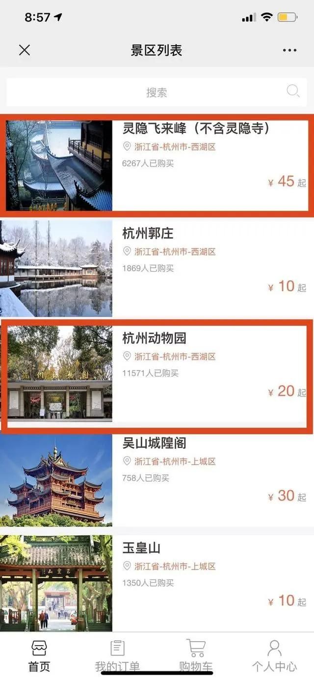 上午8:57,钱江晚报·小时新闻记者打开购票预约平台,发现目前开放出来的可购票的日期里,购票最热门的是杭州动物园,总人数已达到11571人,其次是灵隐飞来峰(不含灵隐寺),总人数有6267人购票,杭州植物园和云栖竹径分别排在第三和第四名,两个景点的购票人数也很接近,总人数分别是4500人和4433人。