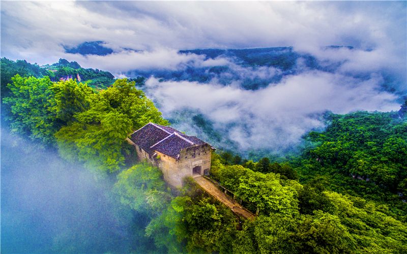 鱼木寨, 为土家族山寨,位于湖北省与重庆市交界处,东距利川市61公里,四周绝壁,占地6平方公里,居住着500多户土家山民。这里有土家古堡、雄关、古墓、栈道和民宅,是国内保存最为完好的土家山寨,景区内城堡寨墙、古栈道保存完好,数十座古墓石雕精湛,隘关险道惊心动魄,村民生产生活用具古朴传统,民族风俗别有风味,素有"世外桃源"之美称。
