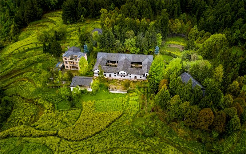 鱼木寨内保存比较完整的土家古建筑“连五间”藏于油菜花海中