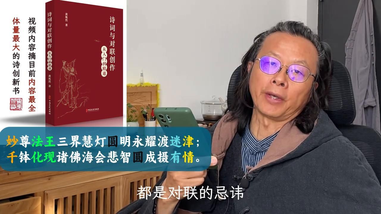 还有下联的"千",最好也是跟上联的一个数字来对应,而不要是像他这样,上联是个"妙","妙"这个形容词对一个数字的"千"。然后这个"有",最好是与"无"相对,而不是他用这个"有"对"迷","迷"对"有"。还有这个法王,法王对画线,这个是结构没有对应,法王是个名词,偏正结构,法修饰王。画线应该是个动补,所以它这个结构是没有对应了,这个问题太多了。