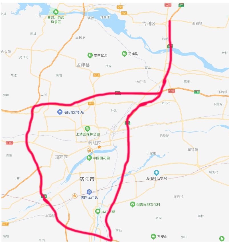 除了目前的洛阳绕城高速公路(即由二广高速、连霍高速、宁洛高速组成的闭环),增加二广、连霍高速立交桥至吉利孟州站段。