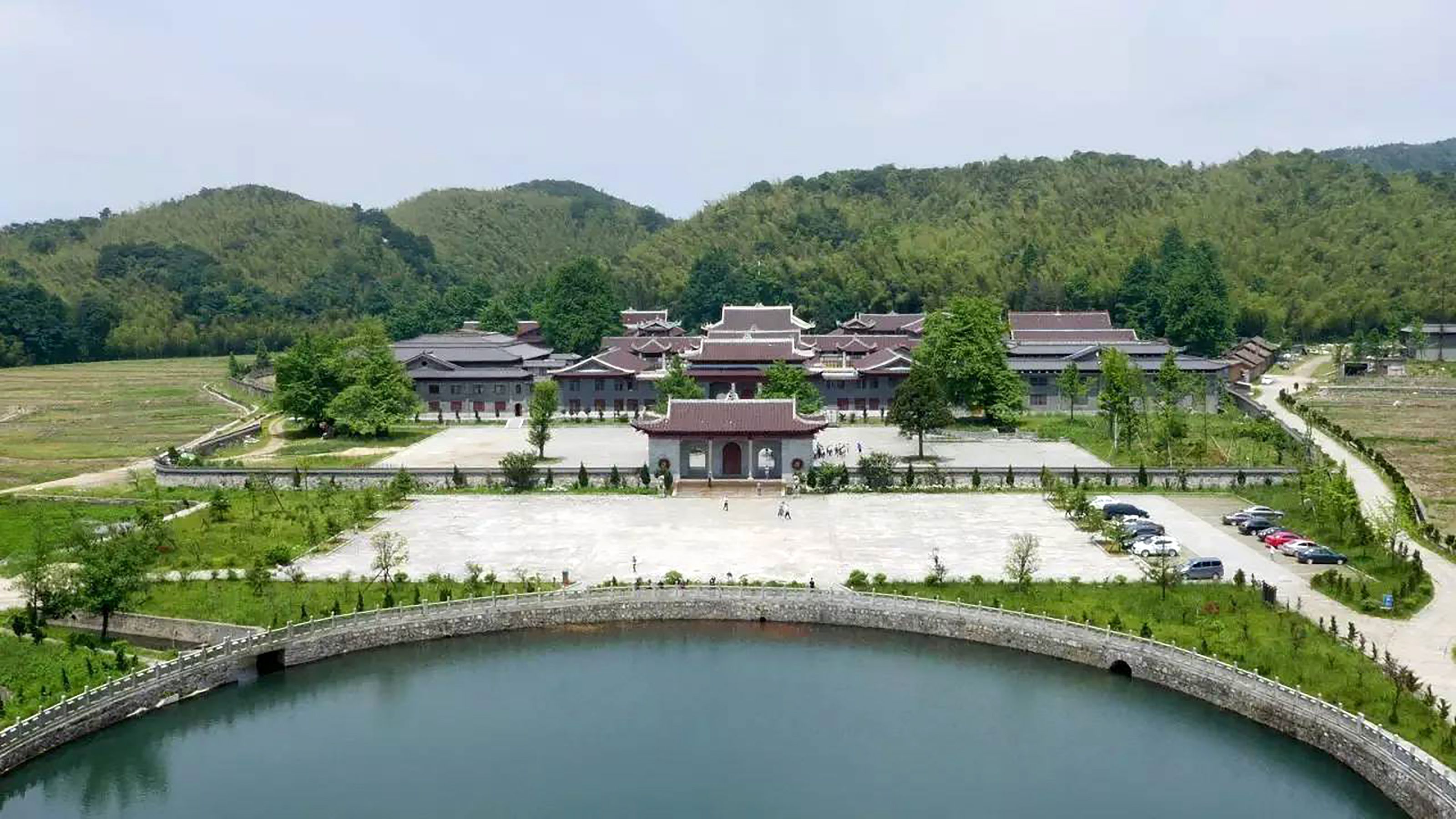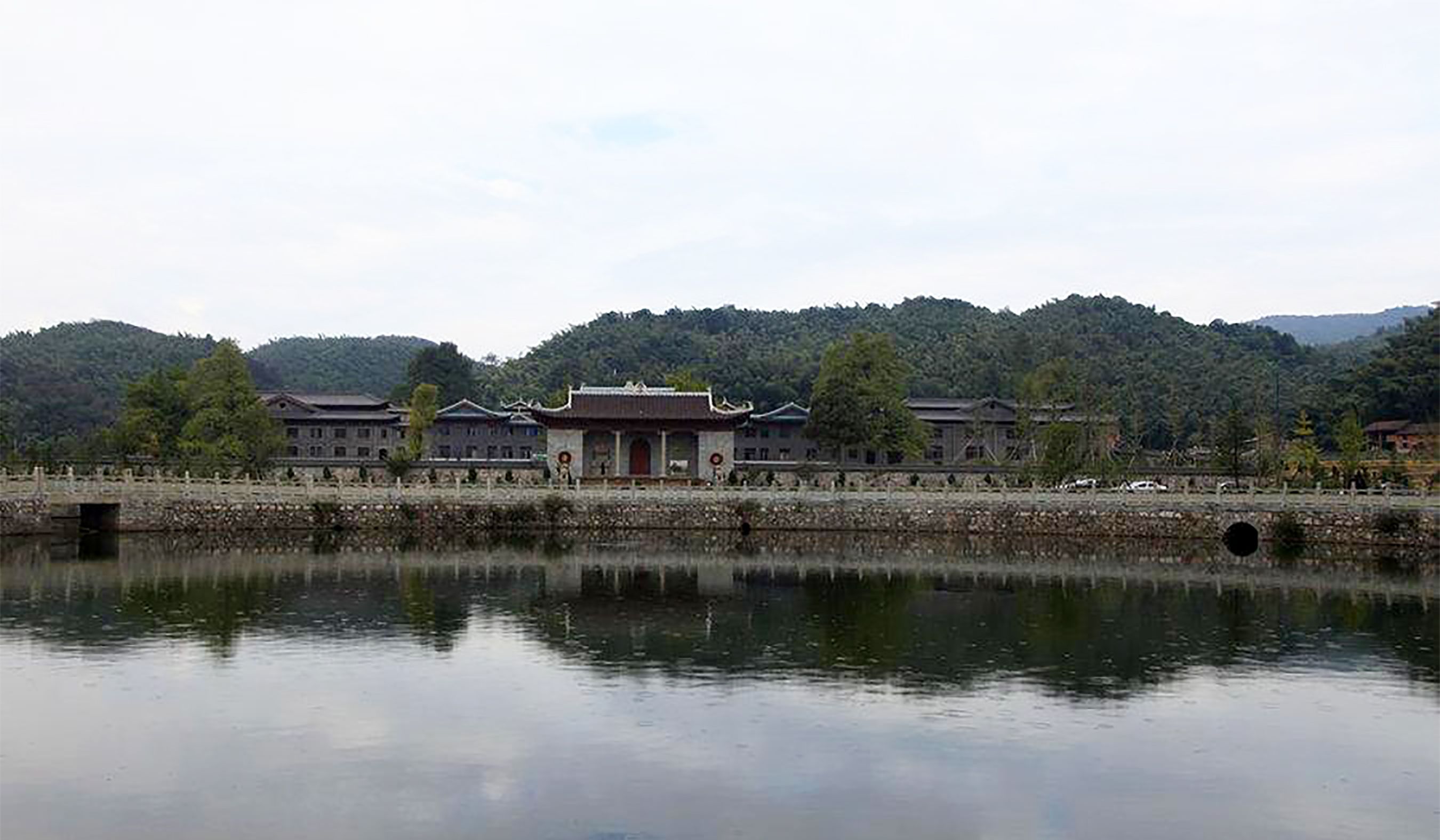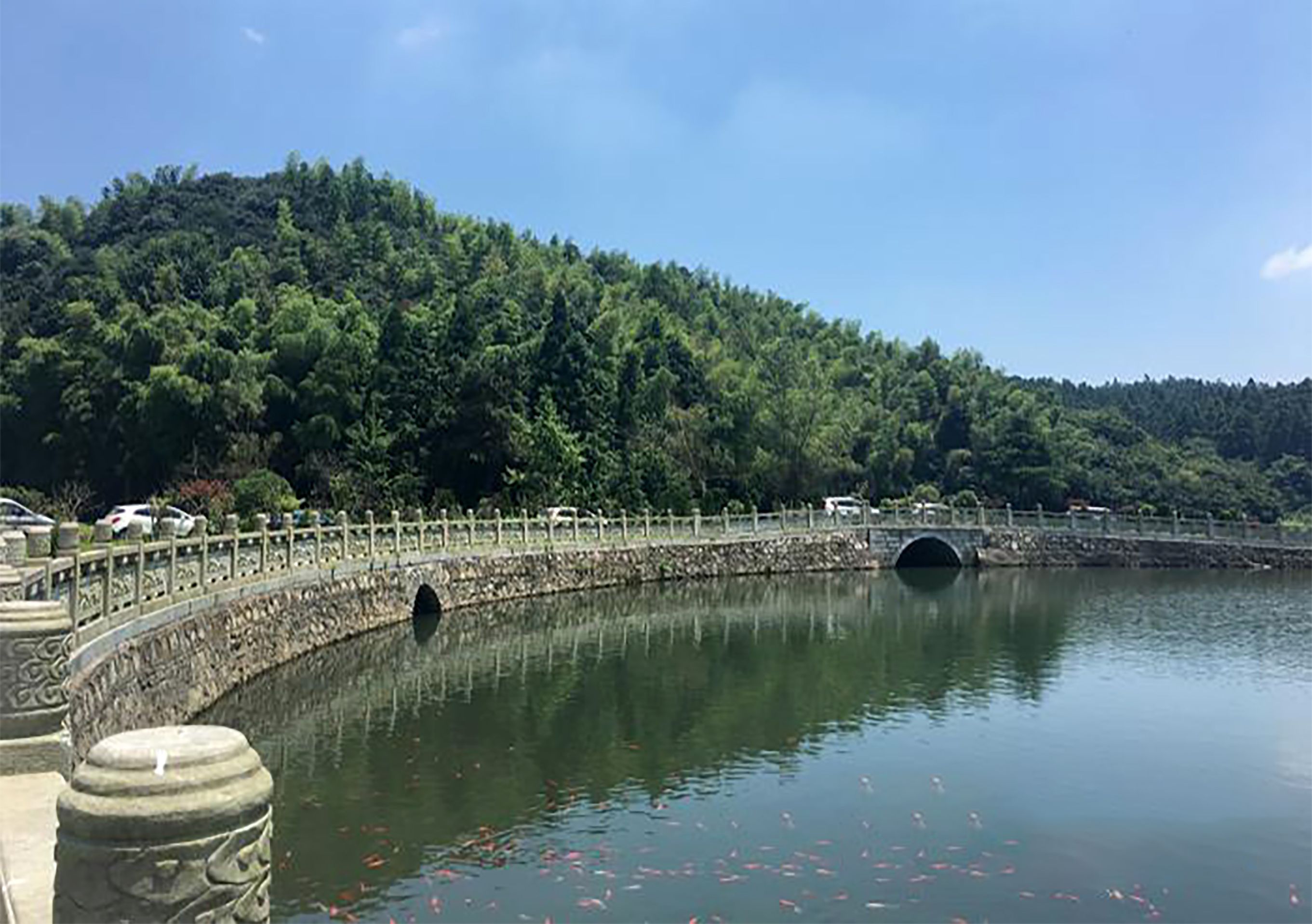 此地近处有一湖,形如皎月,而得名明月湖,又叫“放生湖”,面积十余亩,湖水清澈如镜,不染纤尘。每当日出,金光荡漾,遥射山门,寺楼山影,倒映其中,蔚为壮观。明月湖下端出水口处,有一花岗岩单拱石桥,桥下银珠飞溅,组成迷蒙细雾,中午阳光照射,可现出七色彩虹,因而称为“飞虹桥”。