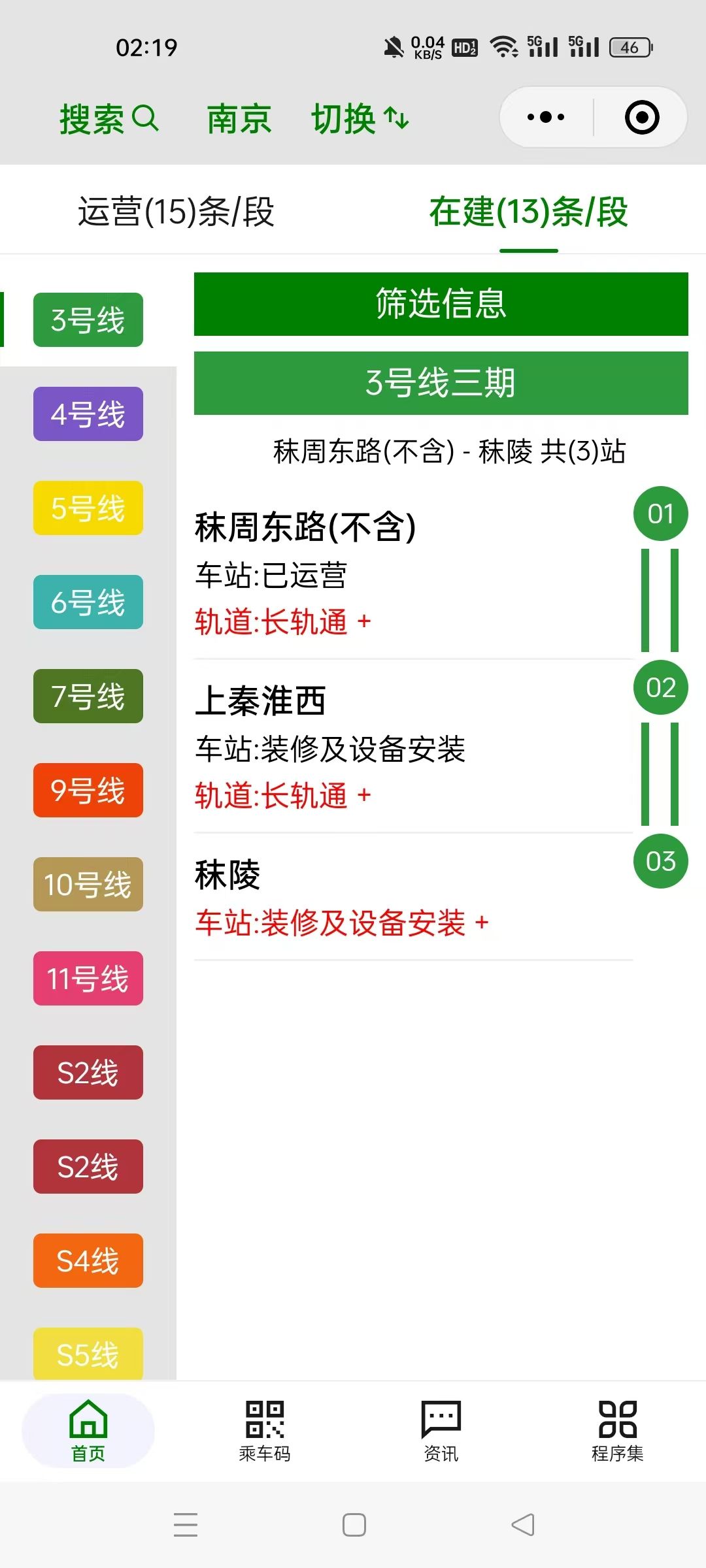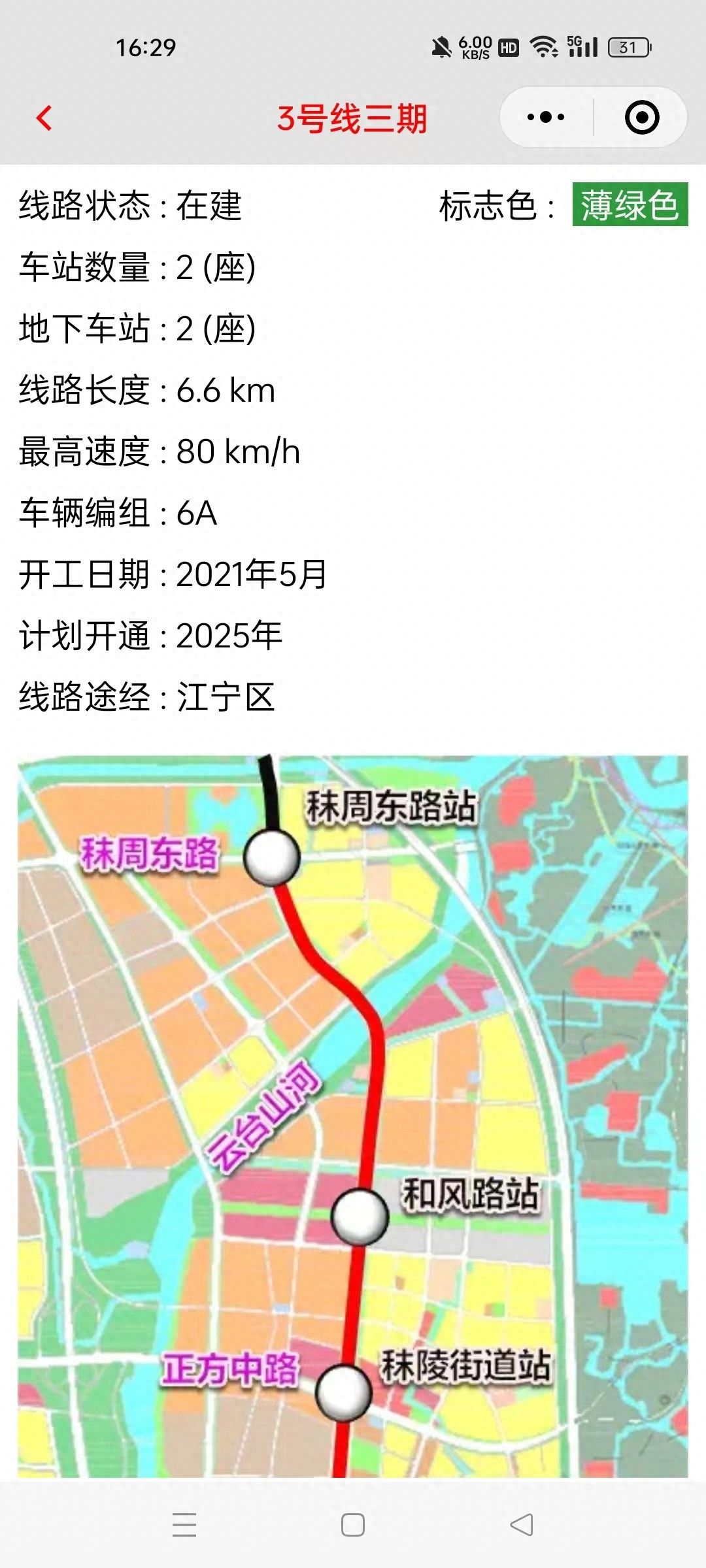 3号线三期(秣周东路-秣陵),计划开通时间:2025年。3座地下车站中,1座已开通,2座已封顶,其中2座装修及设备安装;4个轨行区间中,4个已贯通,其中4个长轨通。