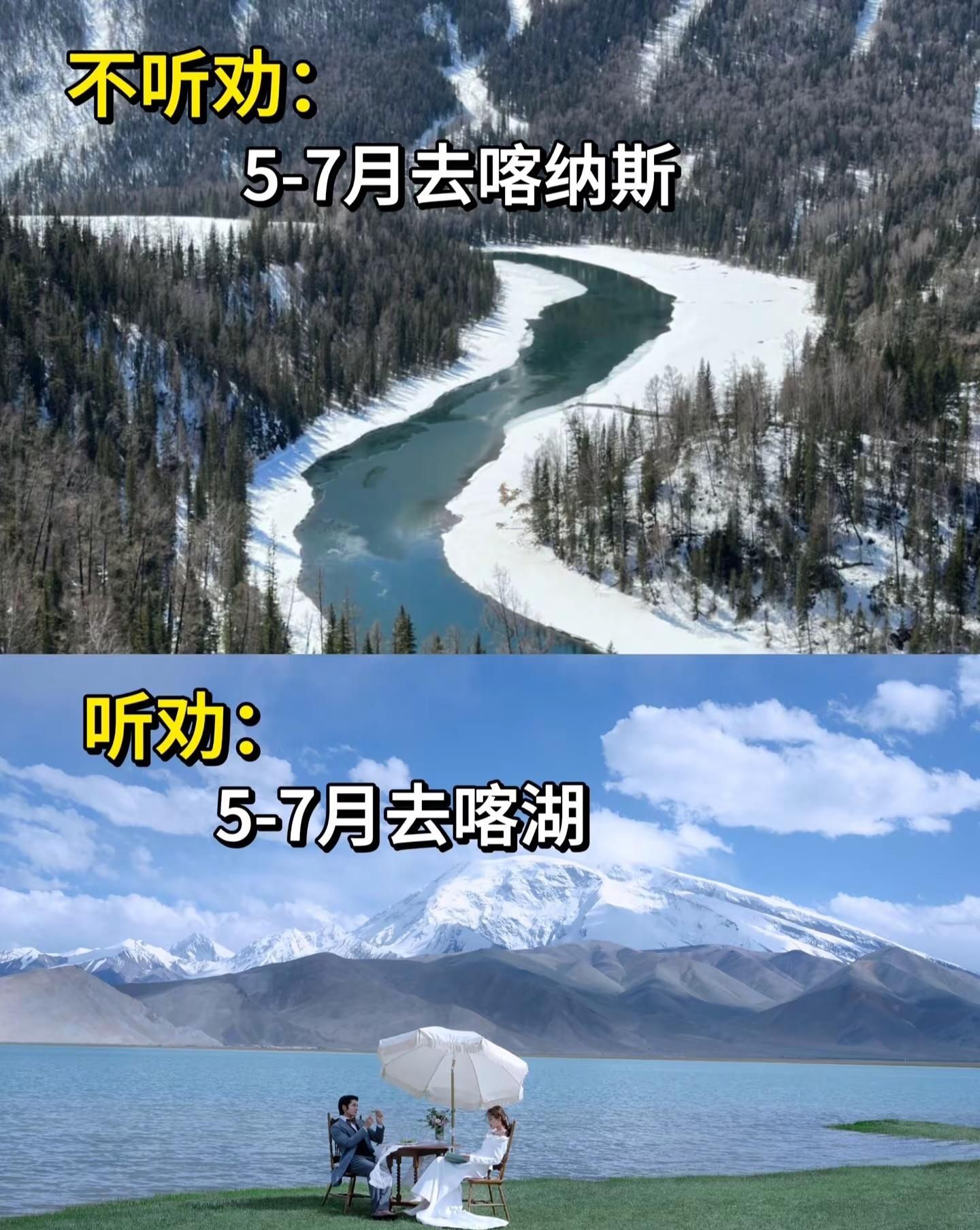那些5-7月准备去新疆的,听我一句劝吧。5-7月准备去新疆旅拍婚纱照或是准备去旅游的朋友,不要再傻傻的跟风去网红景点啦以上给大家总结了几个适合5-7月适合去游玩打卡拍照的景点️-️月适合去:恰西草原与森林:5月开始,恰西的草原逐渐变绿,6-7月时绿草如茵,与周边茂密的雪岭云杉森林相互映衬,形成层次丰富的绿色景观4号冰川️5月喀什地区气温逐渐回升,天气较为晴朗,冰川周边的温度也不会过于寒冷赛里木湖5月开始,赛里木湖周边的野花逐渐绽放,5月下旬到6月是盛花期,赛里木湖的湖水呈现出独特的蓝色,被称为“赛里木湖蓝”库尔德林5月开始,库尔德宁的草原逐渐变绿,库尔德宁周边的雪山,与山下的草原、森林形成鲜明对比,构成了层次丰富的立体景观白沙湖5-7月,白沙湖湖水澄澈,呈现出迷人的蓝色,与岸边金黄泛白的沙丘、远处洁白的雪山相互映衬,构成色彩斑斓的画面慕士塔格峰️春夏交替,降水较少,晴天居多,可以清晰地观赏到慕士塔格峰的雄伟身姿、山体的细节以及周边的冰川、湖泊等景观,非常适合摄影和观光喀湖️喀拉库勒湖湖水深邃幽黯、清澈见底,在阳光的照耀下波光粼粼,闪烁着迷人的光芒奥依塔克冰川奥依塔克冰川所在的帕米尔高原地区,由于海拔较高,气温相对较低,是天然的避暑胜地,在晴朗的天气下,您可以清晰地看到冰川的雄伟壮观天鹅湖降水相对较少,多为晴天,阳光充足,天空湛蓝每年5-7月是天鹅在赛里木湖栖息繁衍的时期,天鹅众多喀什古城5-7月的喀什古城气温逐渐升高,但还未达到夏季的酷热,天气较为舒适,适合长时间在户外活动游玩,这里的异域风情很出片#新疆旅拍婚纱照#新疆婚纱照#新疆目的地婚礼#雪山婚礼#婚纱照攻略