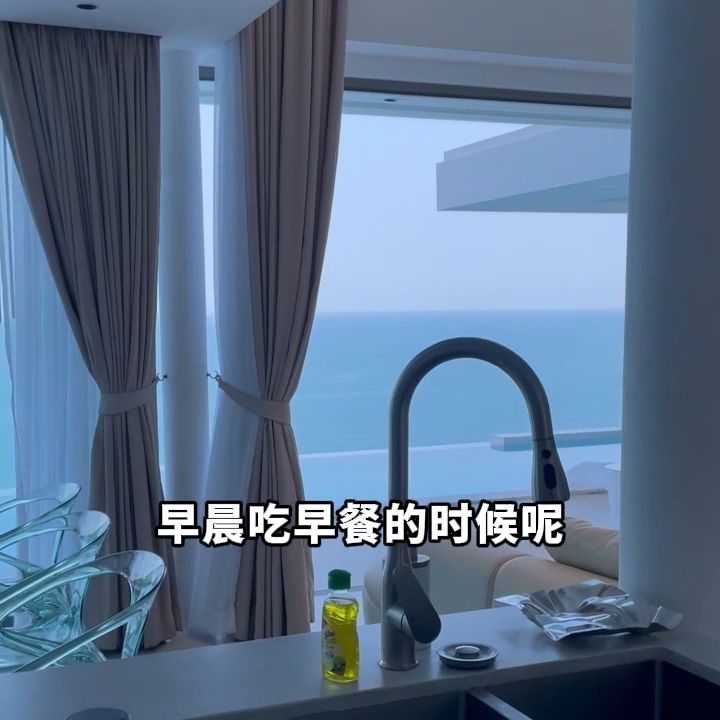 过来这边是一个u型的开放式厨房,采用高端品牌的家电设计成嵌入式的。餐桌也是面朝大海,早晨吃早餐的时候也可以看着太阳升起。