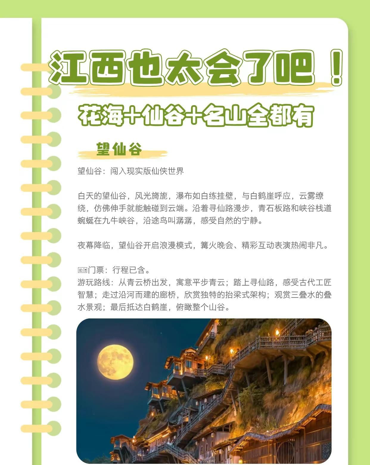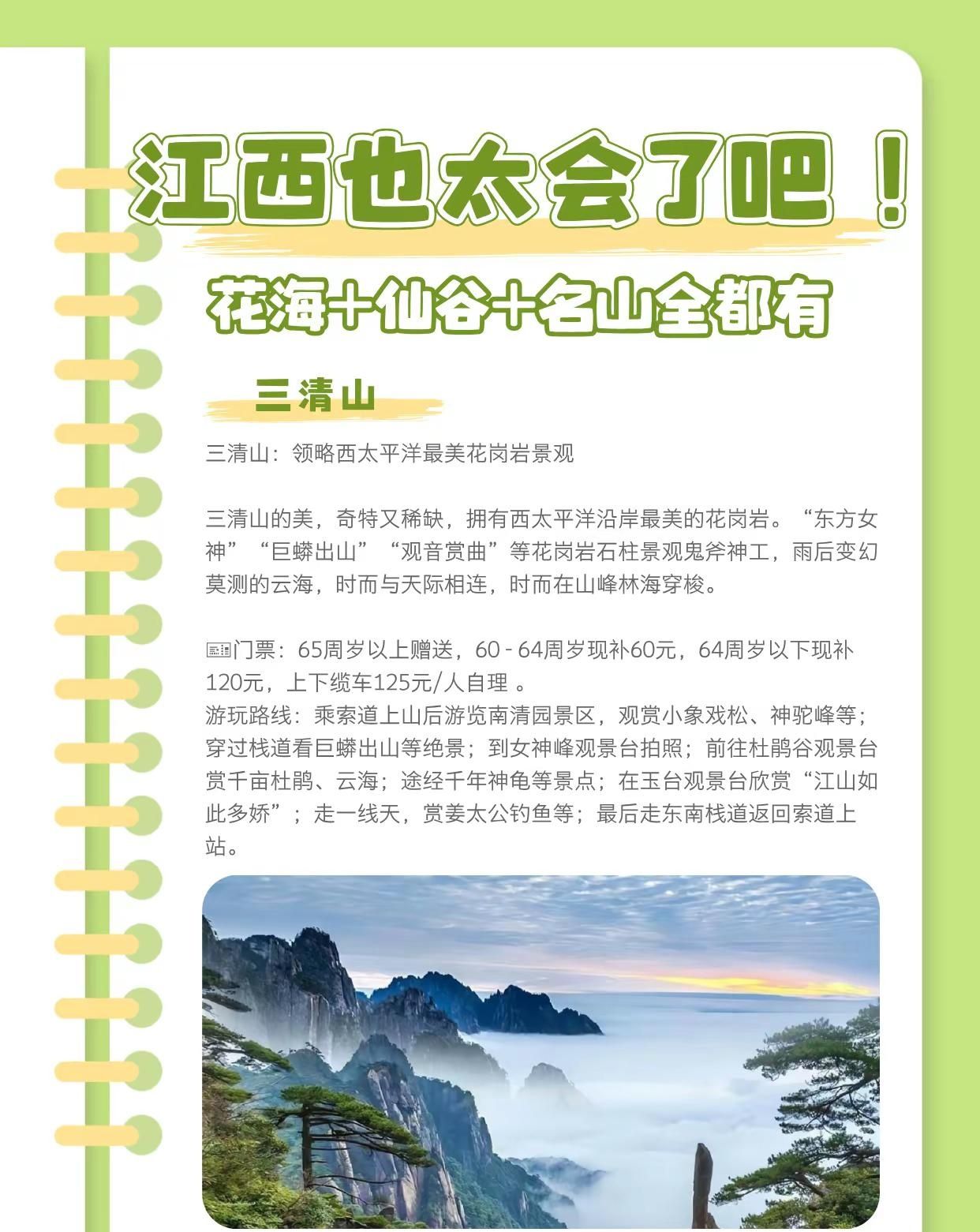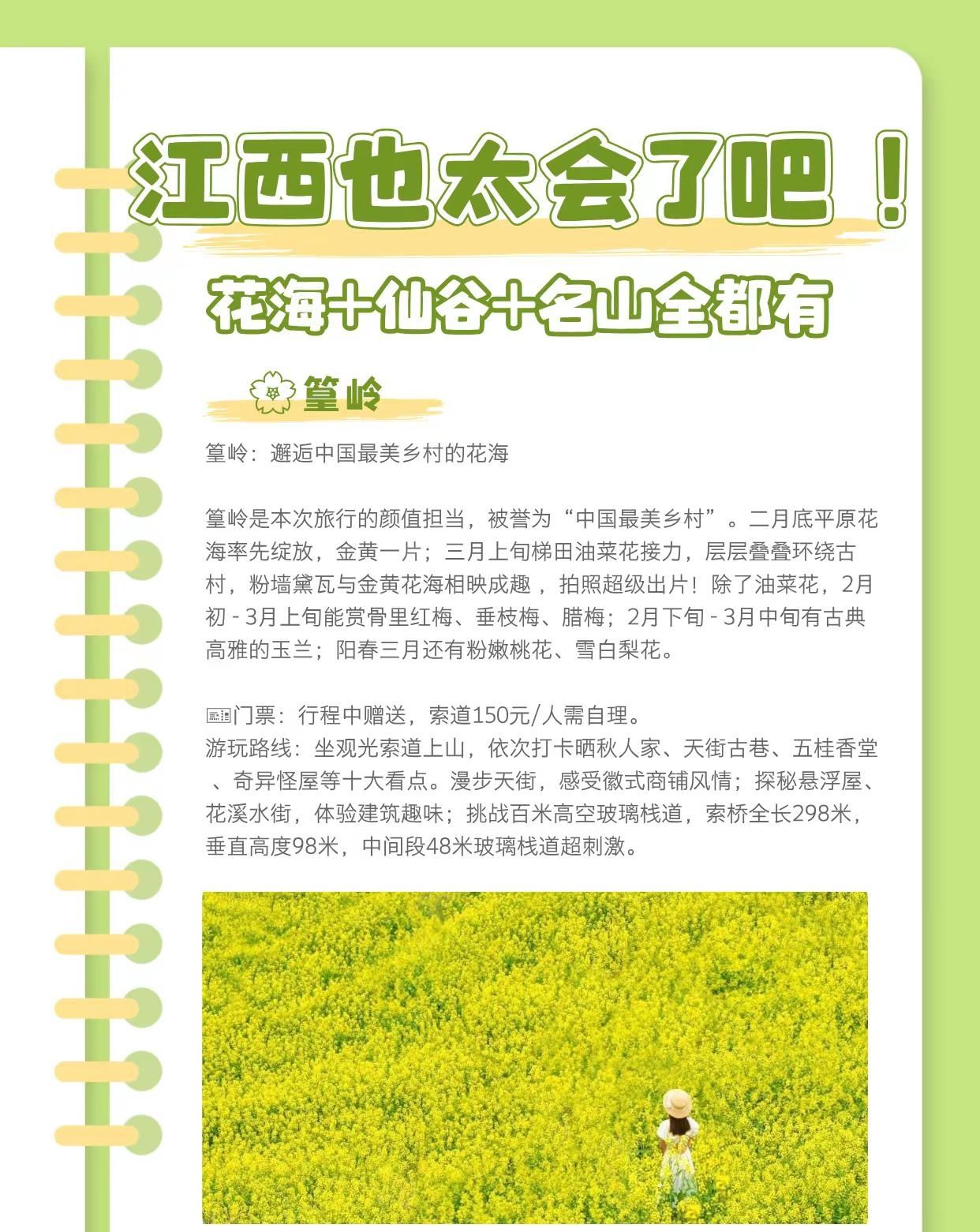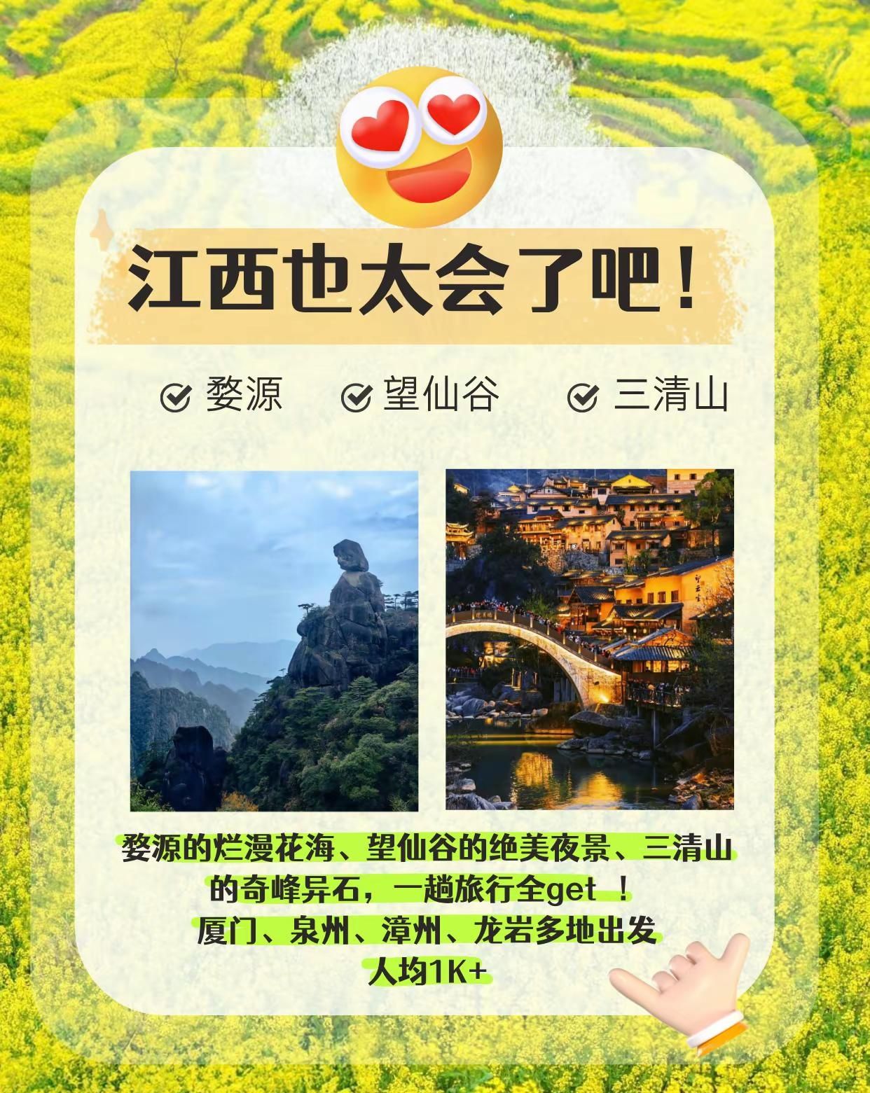 3月江西也太会了吧 婺源油菜花海等你来。被江西的美景狠狠拿捏住了!婺源的烂漫花海、望仙谷的绝美夜景、三清山的奇峰异石,一趟旅行全get! 福建出发3日动车游攻略,人均1K+篁岭:邂逅中国最美乡村的花海篁岭是本次旅行的颜值担当,被誉为“中国最美乡村”。二月底平原花海率先绽放,金黄一片;三月上旬梯田油菜花接力,层层叠叠环绕古村,粉墙黛瓦与金黄花海相映成趣 ,拍照超级出片!除了油菜花,2月初 - 3月上旬能赏骨里红梅、垂枝梅、腊梅;2月下旬 - 3月中旬有古典高雅的玉兰;阳春三月还有粉嫩桃花、雪白梨花。 游玩路线:坐观光索道上山,依次打卡晒秋人家、天街古巷、五桂香堂 、奇异怪屋等十大看点。漫步天街,感受徽式商铺风情;探秘悬浮屋、花溪水街,体验建筑趣味;挑战百米高空玻璃栈道,索桥全长298米,垂直高度98米,中间段48米玻璃栈道超刺激。望仙谷:闯入现实版仙侠世界白天的望仙谷,风光旖旎,瀑布如白练挂壁,与白鹤崖呼应,云雾缭绕,仿佛伸手就能触碰到云端。沿着寻仙路漫步,青石板路和峡谷栈道蜿蜒在九牛峡谷,沿途鸟叫潺潺,感受自然的宁静。夜幕降临,望仙谷开启浪漫模式,篝火晚会、精彩互动表演热闹非凡。 游玩路线:从青云桥出发,寓意平步青云;踏上寻仙路,感受古代工匠智慧;走过沿河而建的廊桥,欣赏独特的抬梁式架构;观赏三叠水的叠水景观;最后抵达白鹤崖,俯瞰整个山谷。 三清山:领略西太平洋最美花岗岩景观三清山的美,奇特又稀缺,拥有西太平洋沿岸最美的花岗岩。“东方女神”“巨蟒出山”“观音赏曲”等花岗岩石柱景观鬼斧神工,雨后变幻莫测的云海,时而与天际相连,时而在山峰林海穿梭。 游玩路线:乘索道上山后游览南清园景区,观赏小象戏松、神驼峰等;穿过栈道看巨蟒出山等绝景;到女神峰观景台拍照;前往杜鹃谷观景台赏千亩杜鹃、云海;途经千年神龟等景点;在玉台观景台欣赏“江山如此多娇”;走一线天,赏姜太公钓鱼等;最后走东南栈道返回索道上站。 #厦门到江西旅游攻略 #泉州到江西旅游攻略三日游 #漳州到江西3天旅游路线 #龙岩到江西旅游攻略 #江西婺源3月份油菜花开了吗 @国旅珍珍|台湾|厦门|金门 @厦门国旅~珍珍