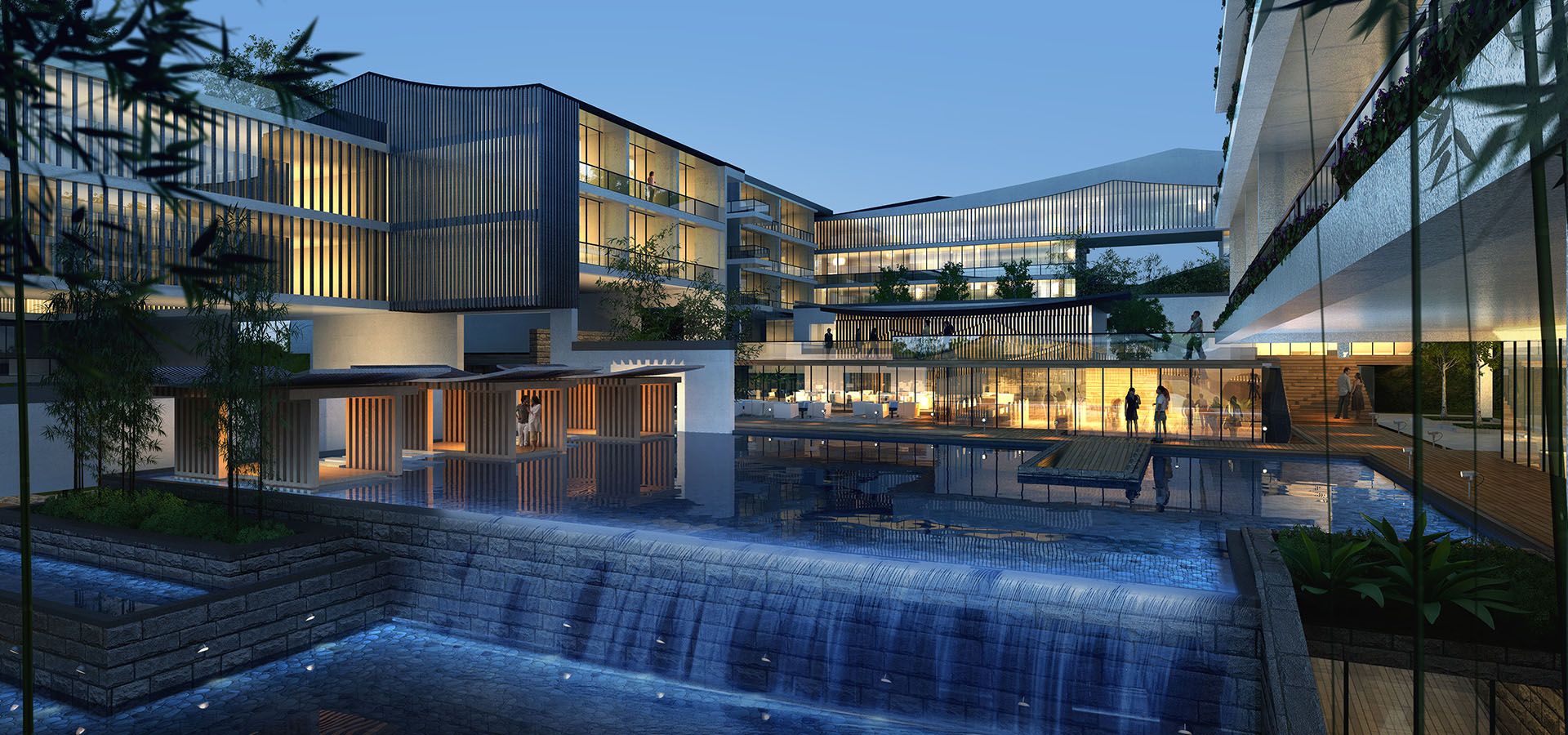 温泉是度假村的根本所在,水与酒店也存在着不解之缘。我们希望以水为轴,公共性空间结合“水轴”布局,私密性空间则围合院落,穿插于“水轴”之上,将每个个体融入“以水为轴”的空间序列中。同时,中轴水院随着高差层层叠落,尽可能不对山体造成破坏。层层叠水的错落处理中,引入水、石、竹、墙等造园元素,并通过对景、夹景、框景、借景、抑景等造景手法,达到现代建筑与传统园林的融合。