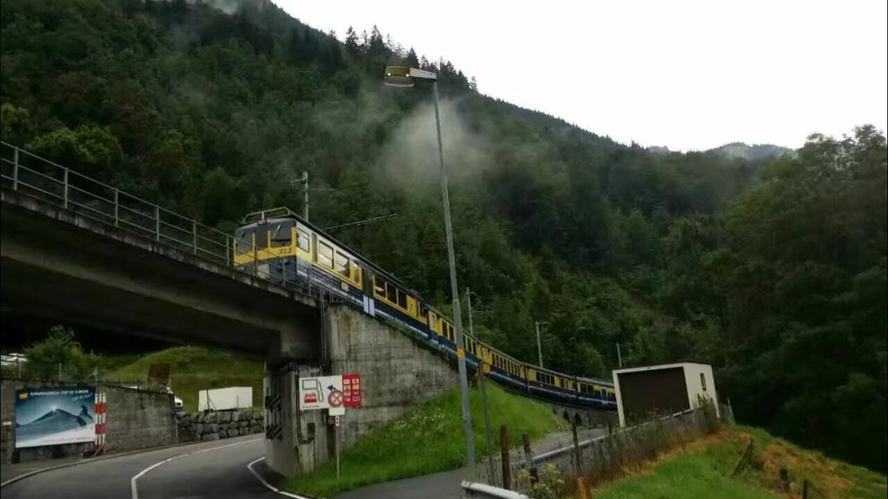 莱茵河在阿尔卑斯山的怀抱中静静地流淌,烟雨朦胧中与我们一路相伴。我们到达瑞士的第一站是卢塞恩,卢塞恩是个8万人口的小城,是瑞士最美的风景文化旅游城市。因为大雨持续,不得已导游取消了原定一小时的市内游览活动,直接改乘火车前往另一个小城因特拉肯。因特拉肯城市1万人口,但是名气非常大,不仅风景非常美,还是手表零售业最发达的地方,更是世界最知名的滑雪胜地——少女峰所在地。从卢塞恩到因特拉肯坐火车约需2小时。全程在山地穿行,为方便旅游观光,速度很慢。好在雨终于停歇了,窗外的风景渐渐明晰起来。