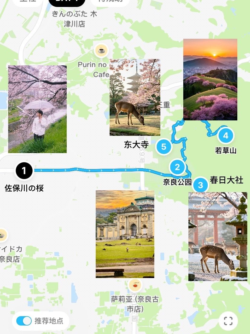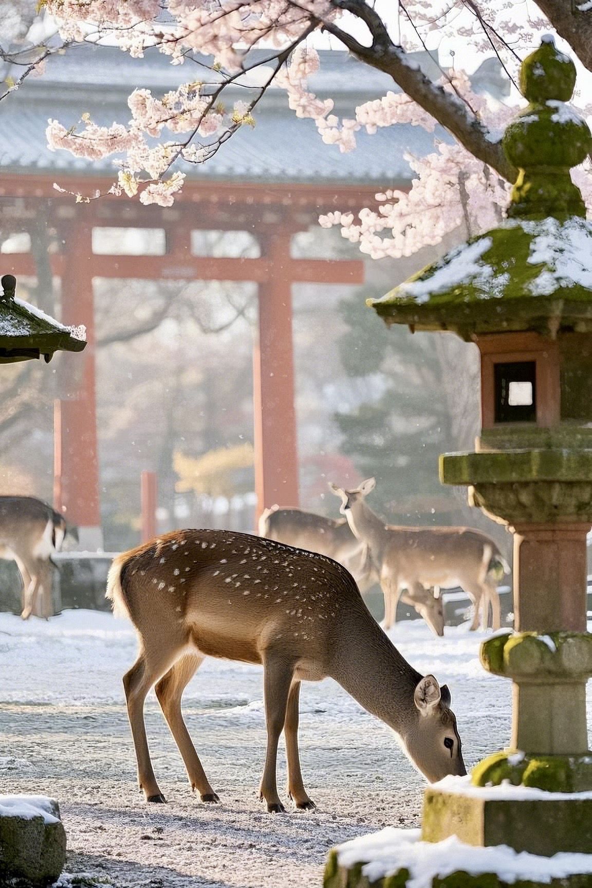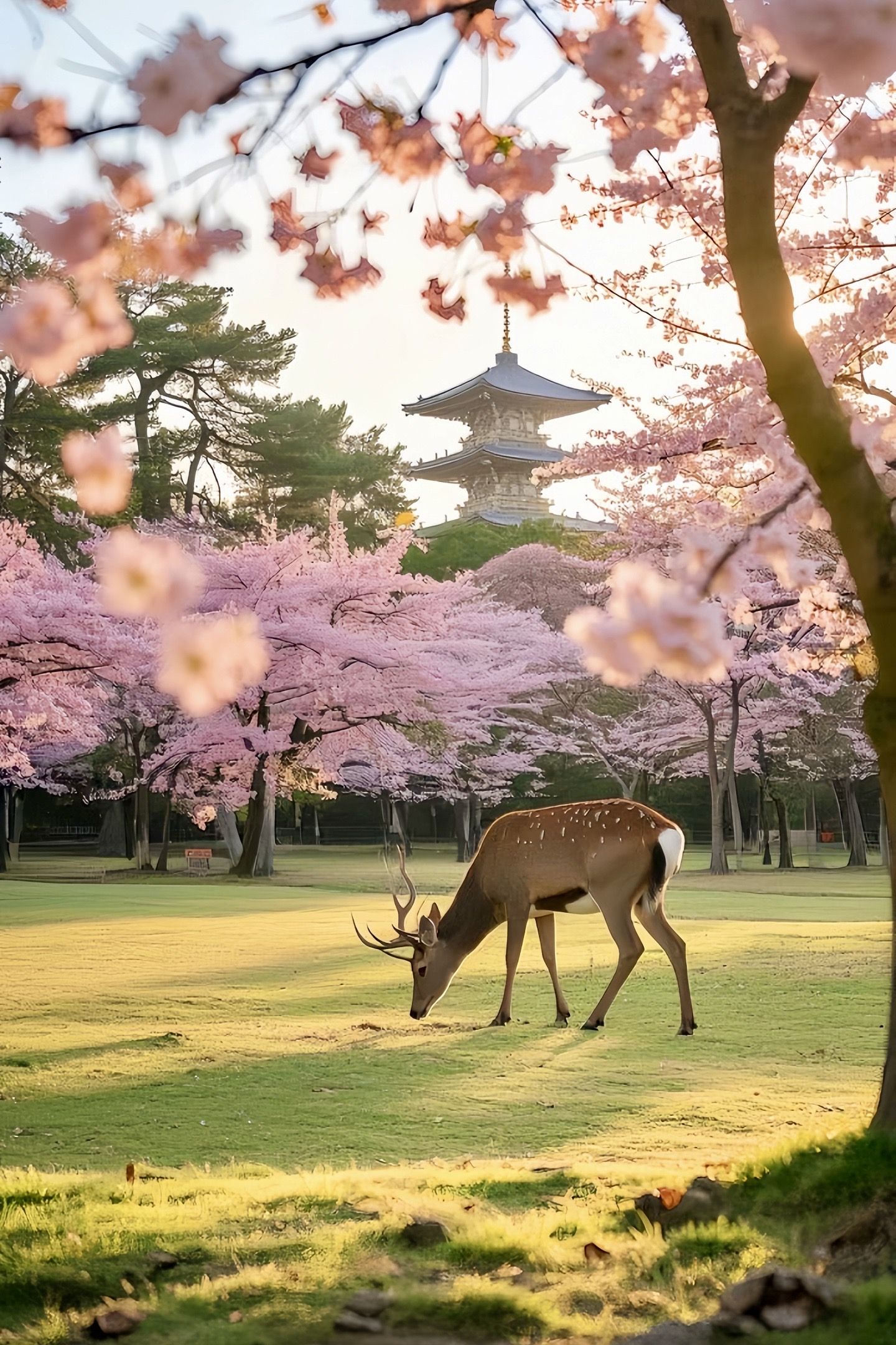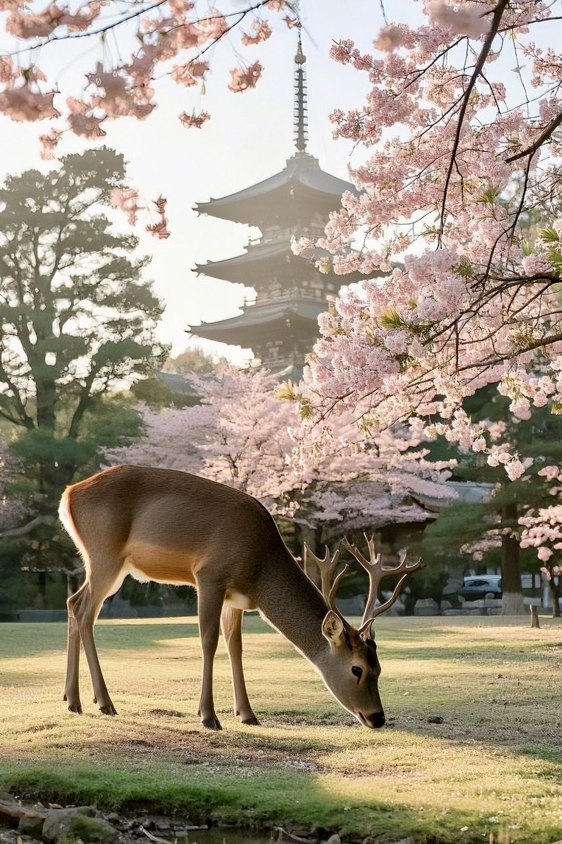 奈良公园(7:00 - 9:00):春日野园地樱花林、东大寺参道染井吉野是赏樱点;喂鹿时鹿饼藏好,一次拿一片,引鹿到樱花树下拍,避开长角鹿群;东大寺南大门樱花与石灯笼同框,机位超绝