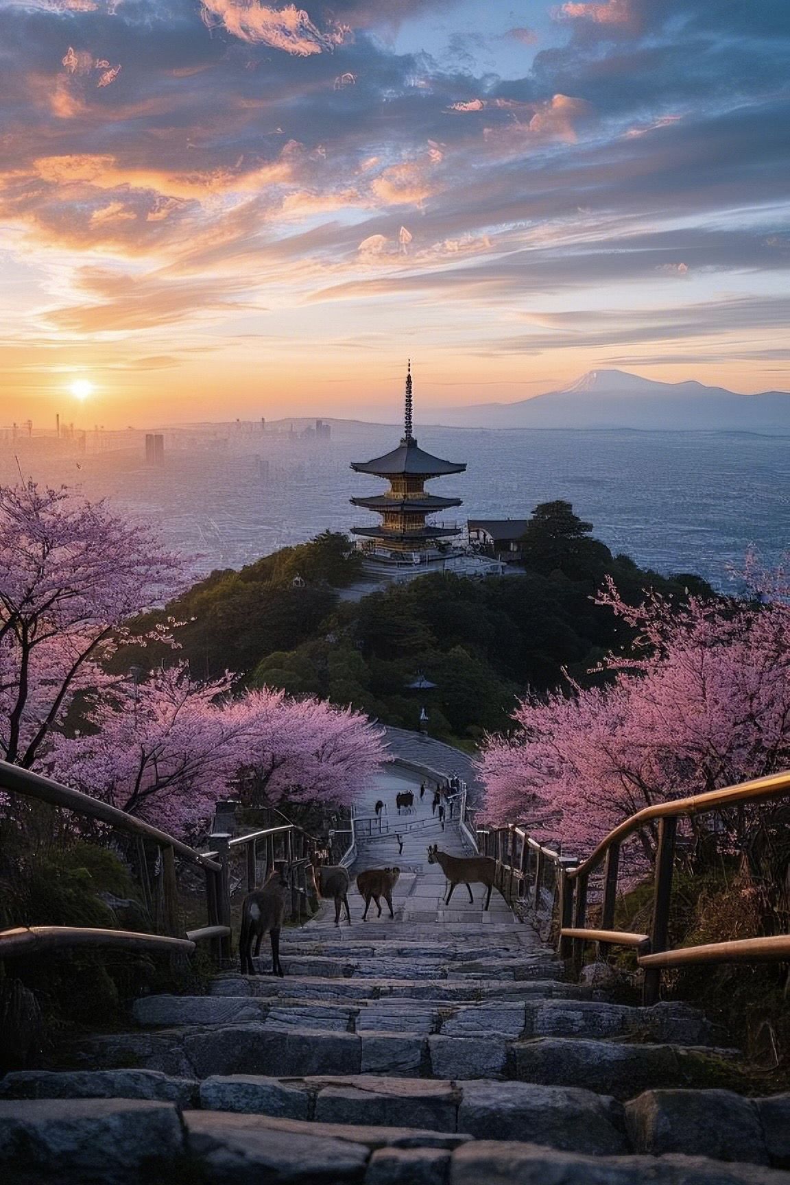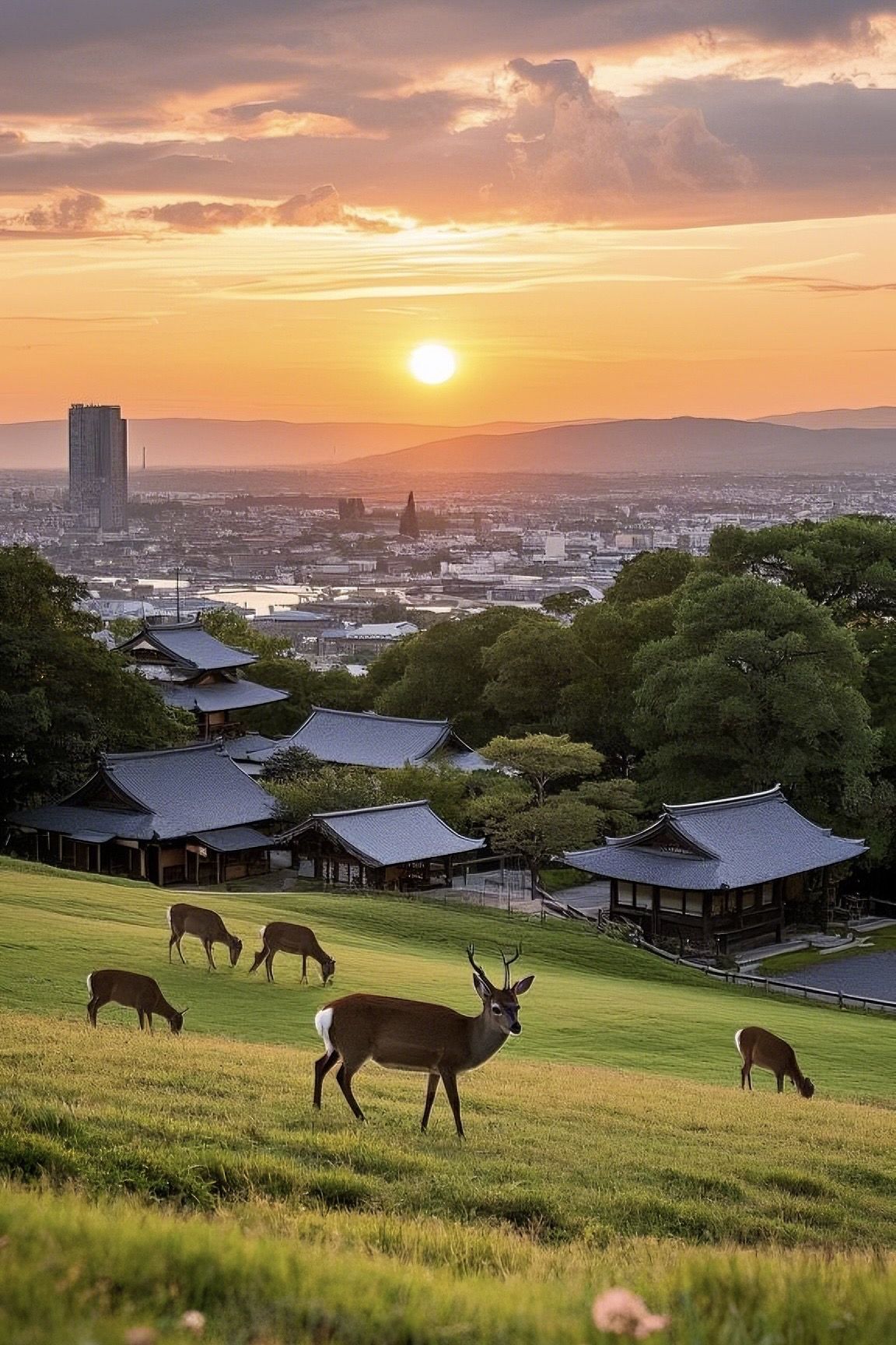 若草山(14:30 - 17:00):3月21日 - 6月15日开放;山腰樱花带和日落、奈良全景、鹿群归山超美;17:00关闭,16:00前登顶
