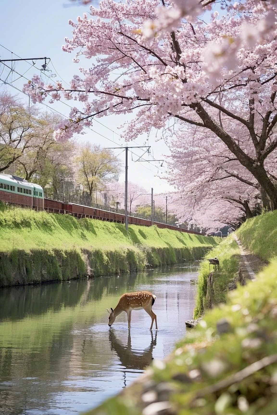 佐保川樱花带(12:00 - 13:30):1.5公里河岸林荫道,人少景美 ,铁路、流水构图赞;用浅景深虚化背景,低角度拍樱花与鹿剪影