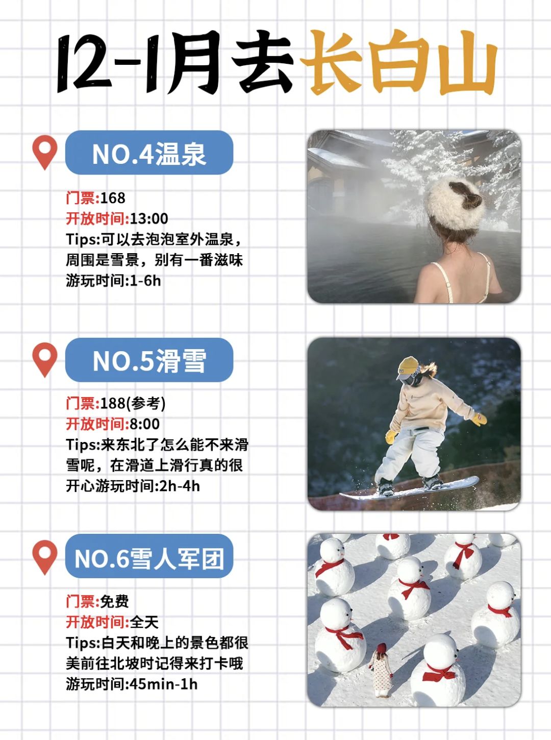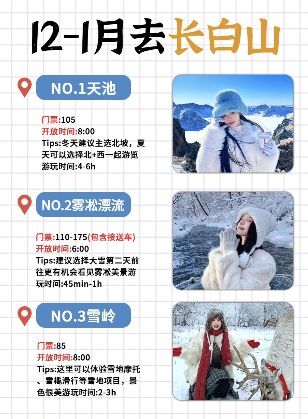 ·天池:分东、南、西、北四个坡,东坡在朝境内去不了,南坡只有夏天才开,西、北坡冬天可去;冬季主选北坡,可坐车直达且景点多,注意保暖!