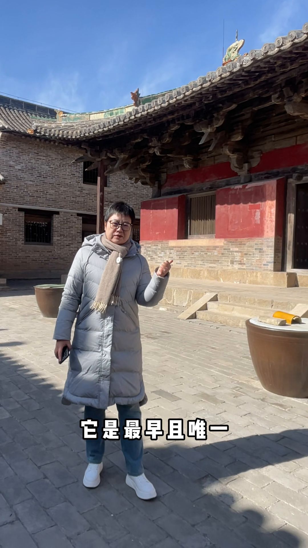 我身后的这个大雄宝殿,崇明寺的大雄宝殿就始建于北宋开宝年间,也就是公元971年。大家注意这个年份,公元971年北宋刚刚开朝第十一年,崇明寺就在山西的古工匠的智慧和勤劳中诞生了。