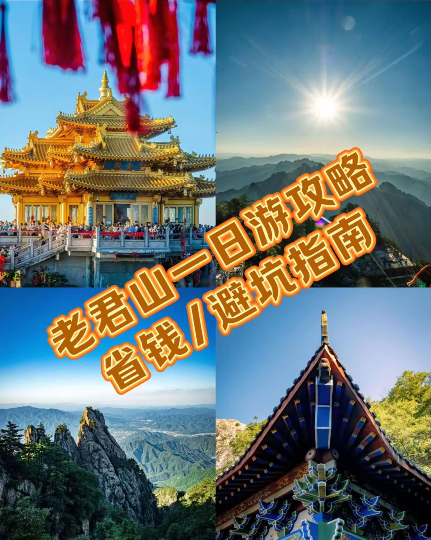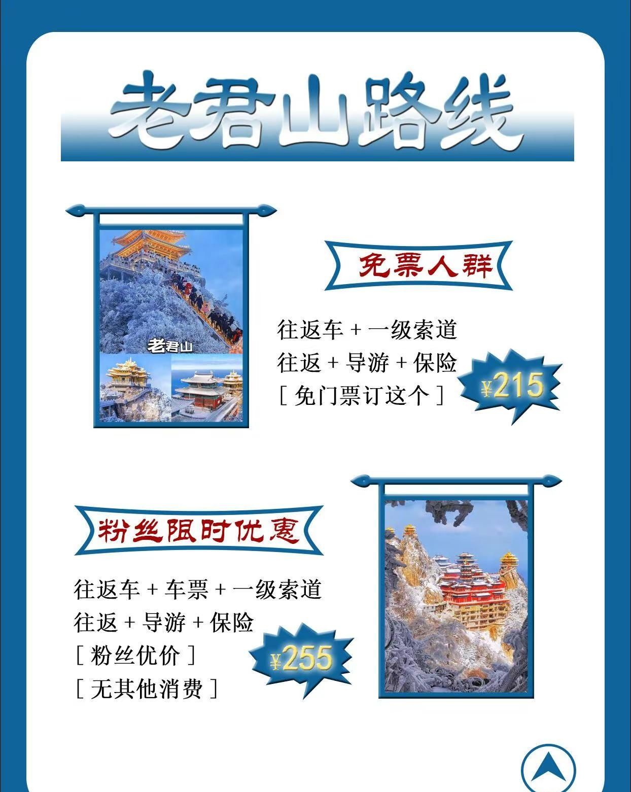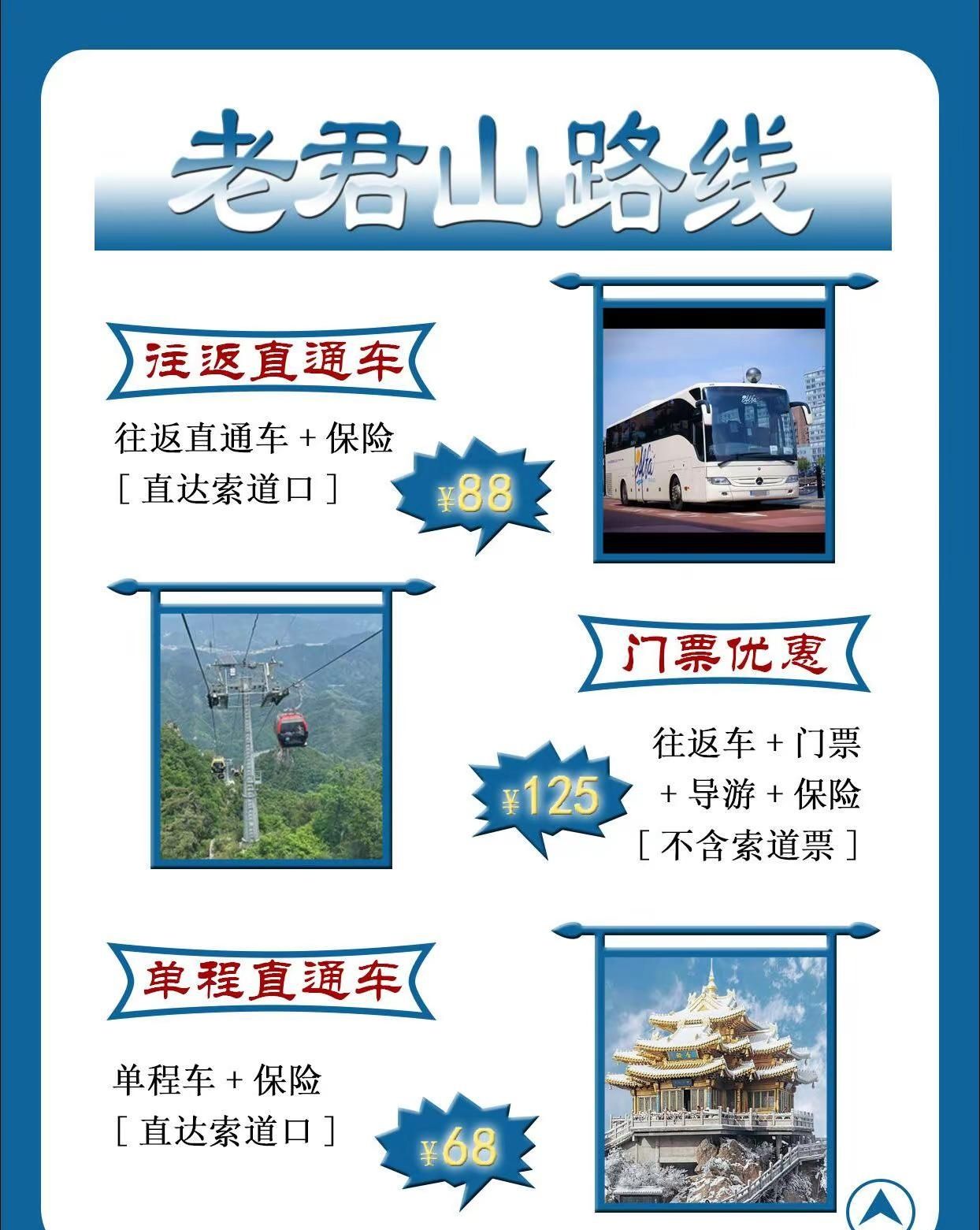 老君山省攻略来了,老君山跟团太划算了。老君山省攻略来了,老君山跟团太划算了老君山在洛阳省栾川县,距离洛阳市区还有100多公里,并不是到了洛阳就到老君山了。很多人做攻略做的头疼,下面给大家说一下,去老君山省省心的办法跟一日游大巴车,并不是我在做老君山一日游才这样说,是老君山一日游真的省又省,听我细细给你讲~来老君山为什么要跟团?跟团不用换乘景交,老君山距离洛阳市区170公里,并不是到了洛阳就到老君山了,坐公共交通只能到大门口,要再换乘景区小交通20。一日游大巴车可以到索道口跟团省心,导游会帮忙办票,讲路线,不用操心做攻略,到了也是自己玩老君山跟团价表?A套餐(12周岁以下且1.4米以下首选):85/人 往返车费保险导游‼B套餐(60 岁以上,现役军人,残疾人等特殊免票人群首选):215/人 往返车费一级索道往返保险导游‼C套餐:255/人,往返车费门票一级索道往返导游保险‼老君山发车时间和上车地点:早班车:7点左右出发,下午16:30返程晚班车:10点左右出发,下午20:00返程天天发车,一天两班,走高速,到索道口,不用换乘景交,行李可放车上,到了自行游玩,住的地方离那个上车点近从哪上车老君山行程安排:爬山路线:检票口——一段索道——中天门——十里画屏——南天门——金殿道馆群老君山检票口索道口,7公里山路,中间没什么风景,坐景交20元,来回40.跟团的话到索道口,不用换乘景交一段索道中天门,坐索道15分钟,爬山5小时。这段是盘山公路,没什么风景,一段索道要坐!中天门十里画屏,坐索道15分钟,爬山1—1.5小时,有两条路,建议走右手边木栈道,缓!十里画屏南天门,风景很好,精髓随景点都在这,不拍照1.5小时,拍照2小时左右南天门金顶道观群,66个台阶,15分钟就到了老君山旅游攻略就写到这里了,希望大家有一个愉快的老君山之旅#洛阳旅游 #老君山雪景 #洛阳老君山 #老君山#远赴人间惊鸿宴 #这个冬天一定不能错过老君山