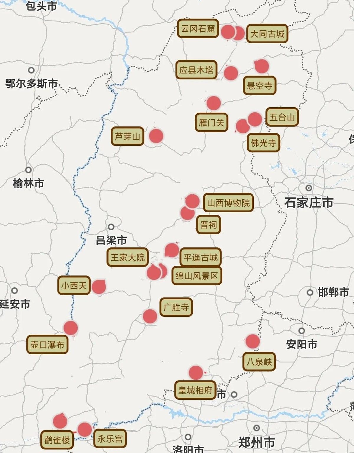 去山西旅游过几次,总结出20个值得去的景区,既有名胜古迹也有自然风光(排名不分先后)。现将各景区概况及地址、门票信息列举如下(附景区分布图):