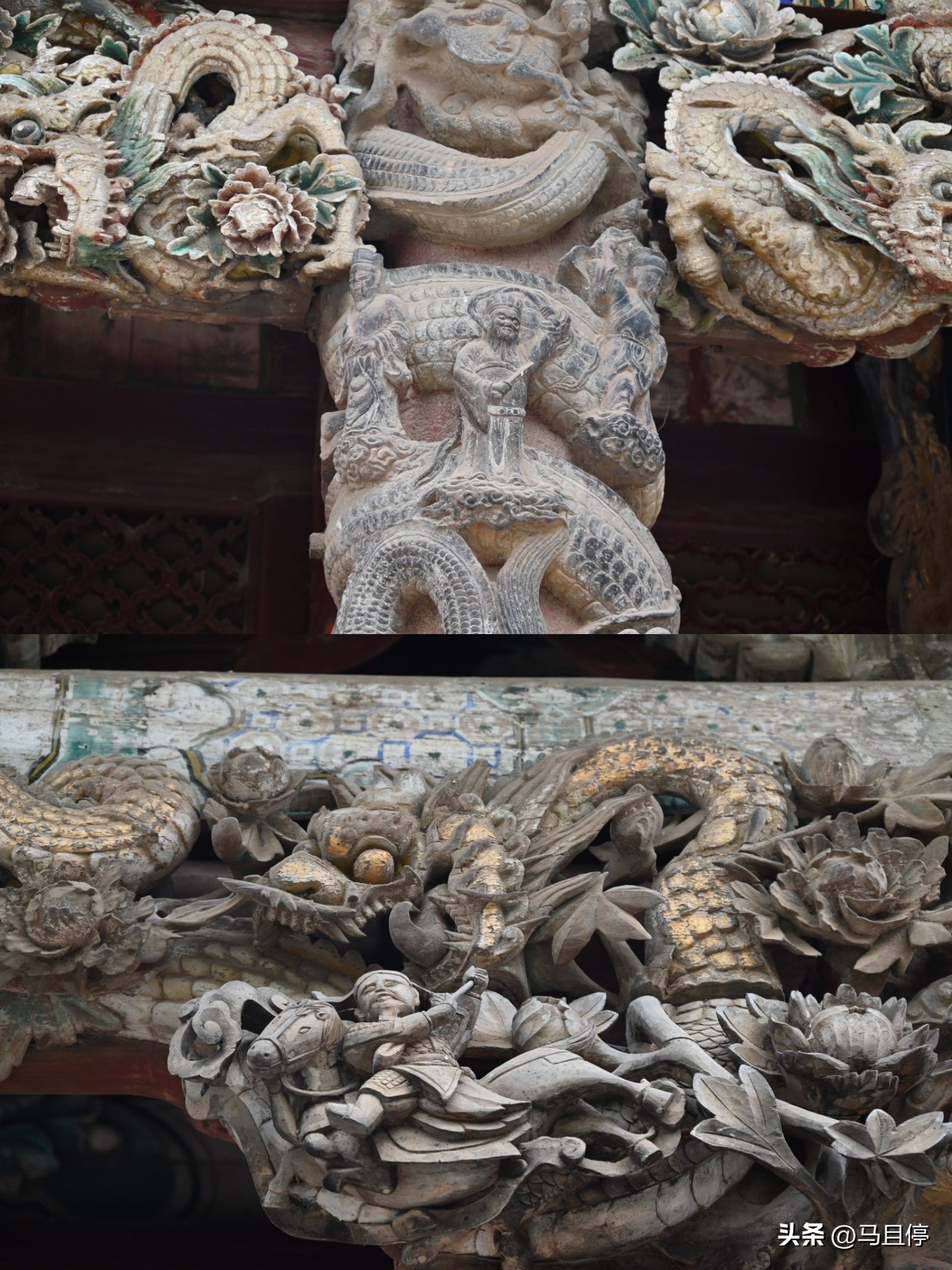 关帝殿是一个有着800多年历史的滚龙柱,上面雕刻了八仙过海、电母风伯、雷公雨师等形象,栩栩如生。而三义殿的雕刻就要更丰富一些,雕刻了中国上至周朝、下至唐代的300多个历史故事和神话传说人物,人物小巧但很精美。
