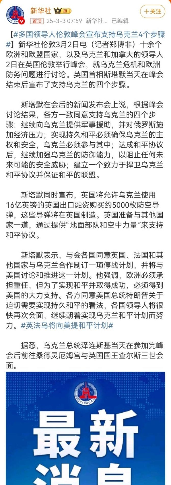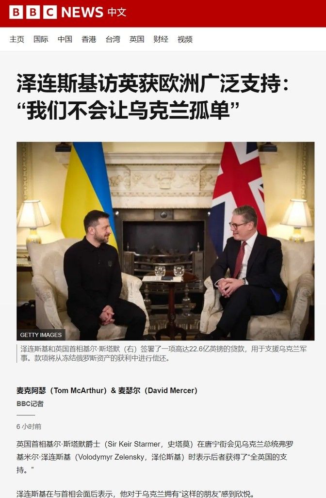 3月1号,英国首相斯塔默在唐宁街10号接见了泽连斯基,并表示英国全力支持乌克兰。