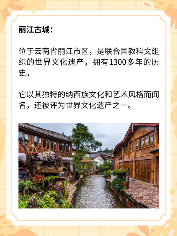 位于云南省丽江市区,是联合国教科文组织的世界文化遗产,拥有1300多年的历史。