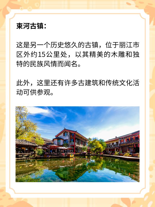 这是另一个历史悠久的古镇,位于丽江市区外约15公里处,以其精美的木雕和独特的民族风情而闻名。