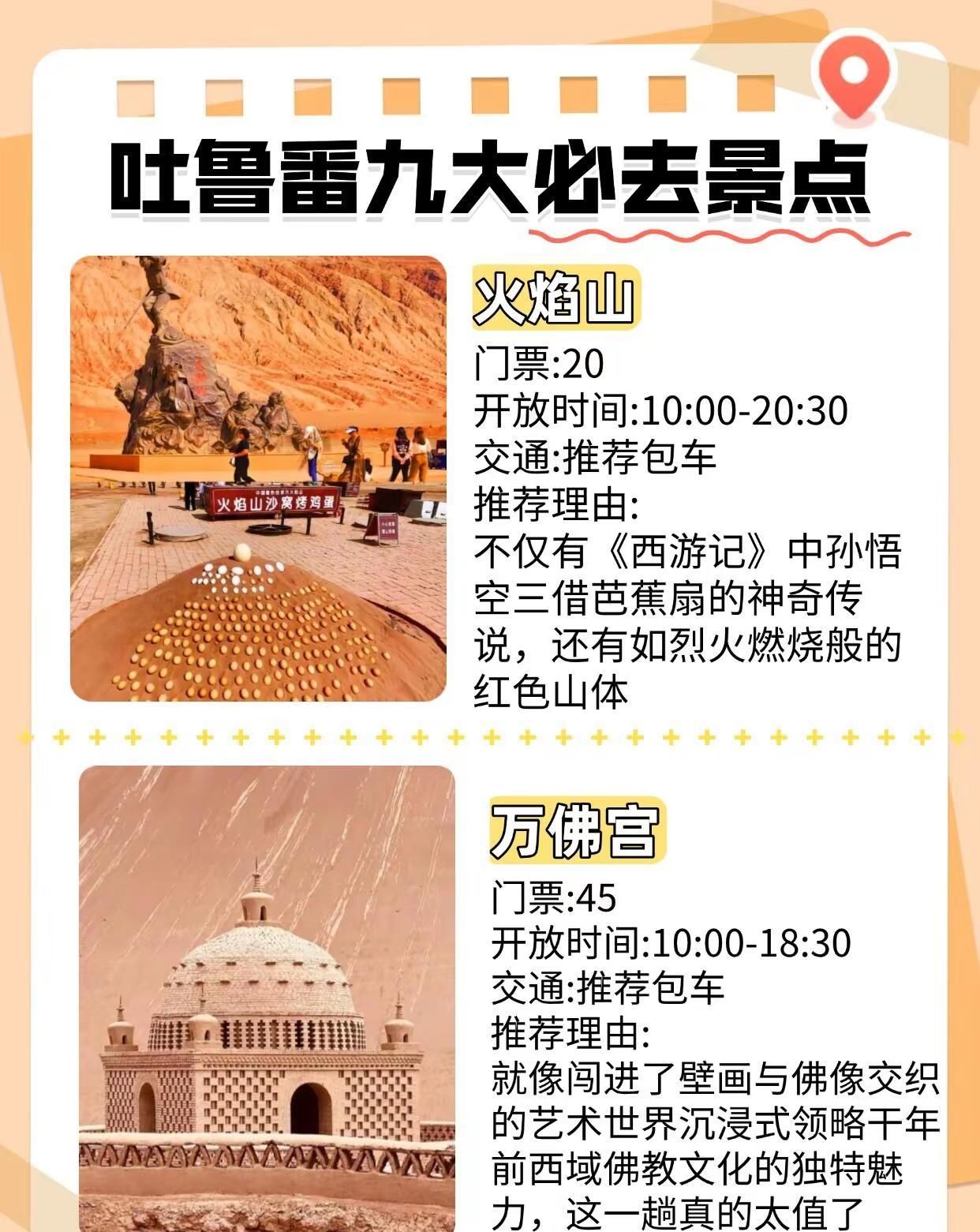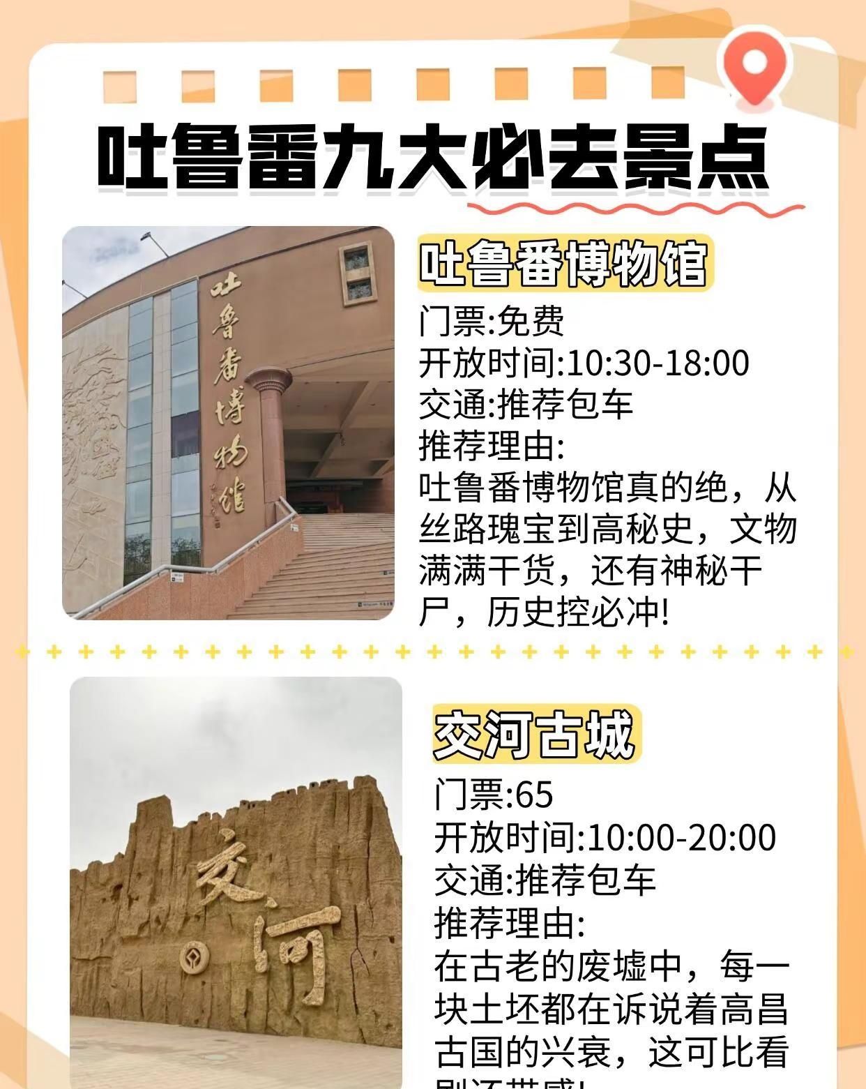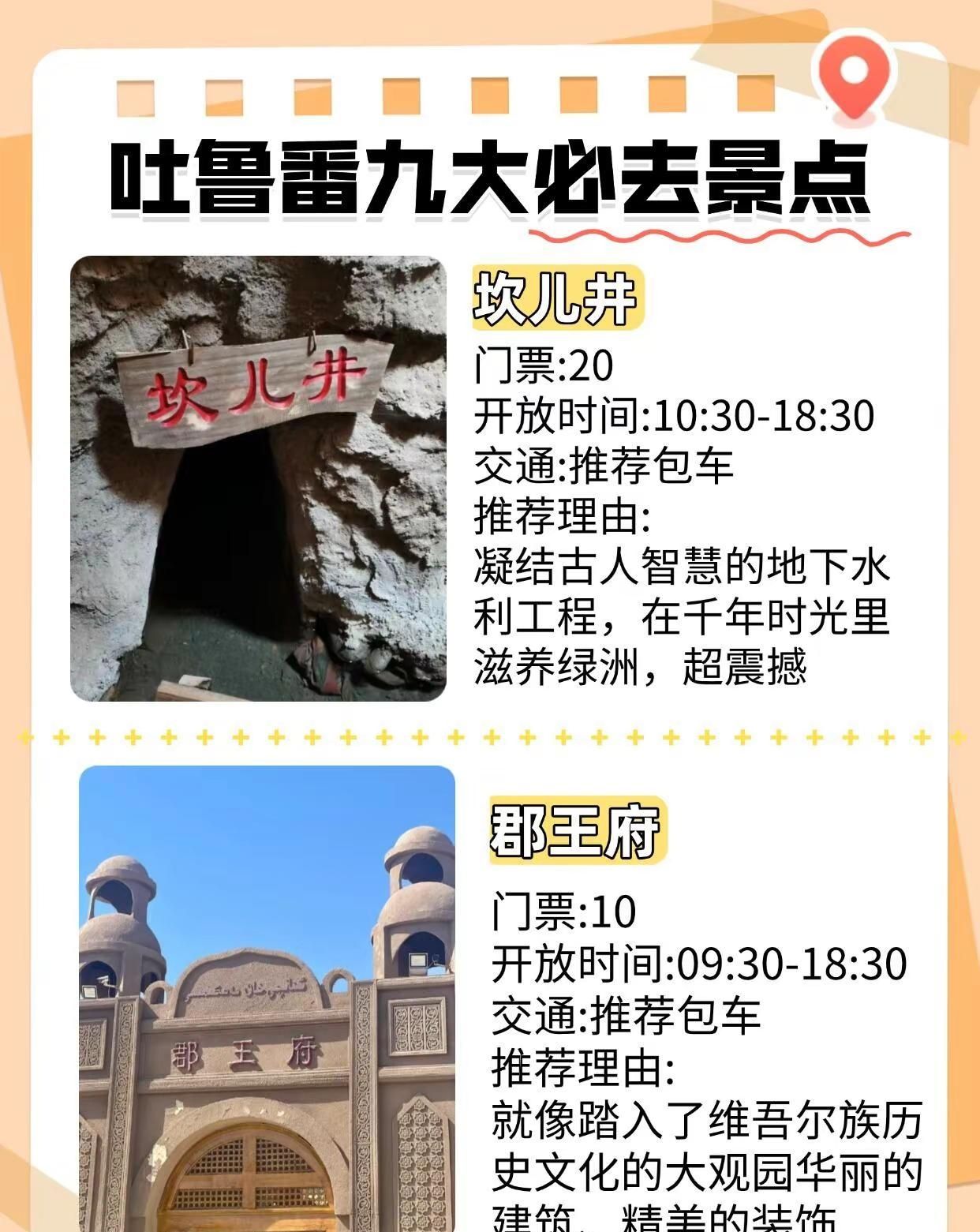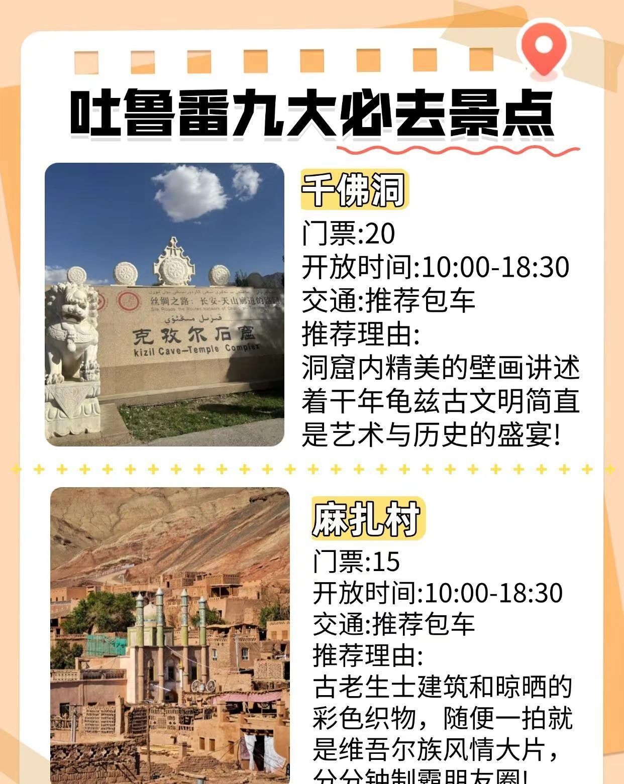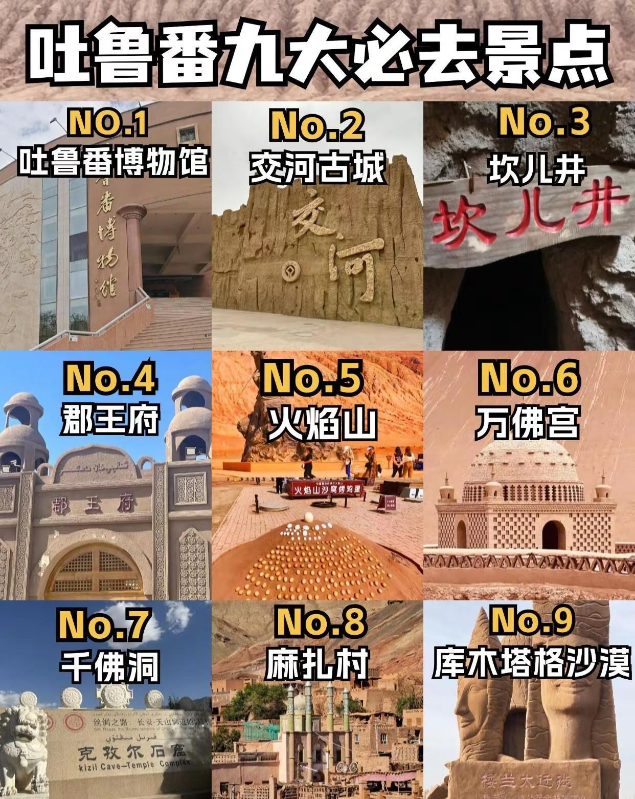 吐鲁番必去9大宝藏景点:旅游。吐鲁番必去9大宝藏景点:宝藏景点:旅游前必看指|||吐鲁番,这座镶嵌在丝绸之路上的璀璨明珠,正以其独特的历史韵味与自然风光,向你发出热情的邀请! 作为吐鲁番的土著,我精心挑选了以下9个必去景点,带你领略这座城市的无限魅力! 吐鲁番博物馆 一踏入博物馆,仿佛穿越千年,每一件文物都在诉说着古老的故事。丝路瑰宝、高昌秘史,等你来一一揭开它们的神秘面纱! 交河古城 漫步在交河古城的废墟中,每一步都踏着历史的回响。高昌古国的辉煌与衰落,都凝聚在这些古老的土坯之中。 坎儿井 坎儿井,古人智慧的结晶,滋养了吐鲁番的绿洲。站在井边,感受这份来自千年的震撼与敬畏吧! 郡王府 郡王府,维吾尔族历史文化的大观园。华丽的建筑、精美的装饰,让你仿佛置身于一个充满异域风情的梦境之中。 火焰山 火焰山,那个《西游记》中孙悟空三借芭蕉扇的地方。红色的山体如同烈火燃烧,大自然的鬼斧神工令人叹为观止! 万佛宫 万佛宫,艺术的殿堂。壁画与佛像交织,沉浸在西域佛教文化的独特魅力中,感受心灵的宁静与洗涤。 千佛洞 千佛洞,艺术与历史的盛宴。精美的壁画讲述着千年龟兹古文明的故事,让人流连忘返。 麻扎村 麻扎村,维吾尔族风情的画卷。古老生土建筑、晾晒的彩色织物,每一处都是拍照的绝佳背景,轻松制霸朋友圈! 库木塔格沙漠 库木塔格沙漠,摄影爱好者的天堂。落日剪影、沙丘漫步、异域风情写真...每一个瞬间都能定格成永恒的美!吐鲁番,这座舒适悠闲的城市,正等待着你的到来!别犹豫了,带上你的行囊,踏上这场充满惊喜与感动的旅程吧!#吐鲁番旅游攻略 #吐鲁番一日游 #吐鲁番