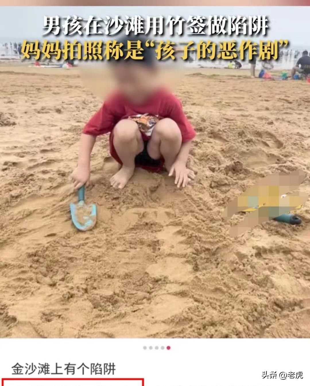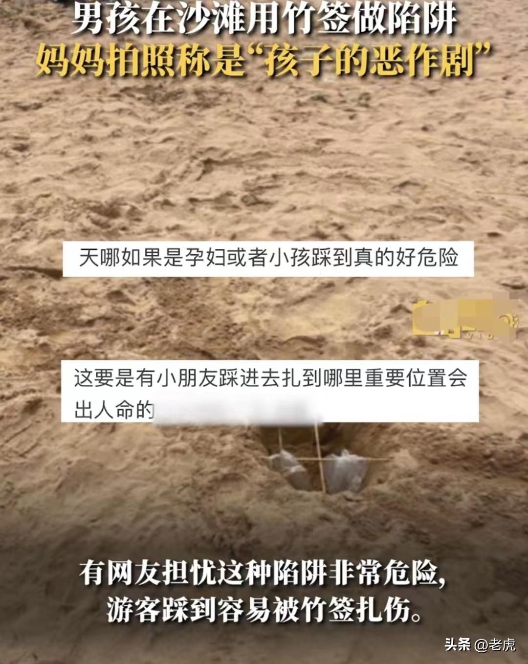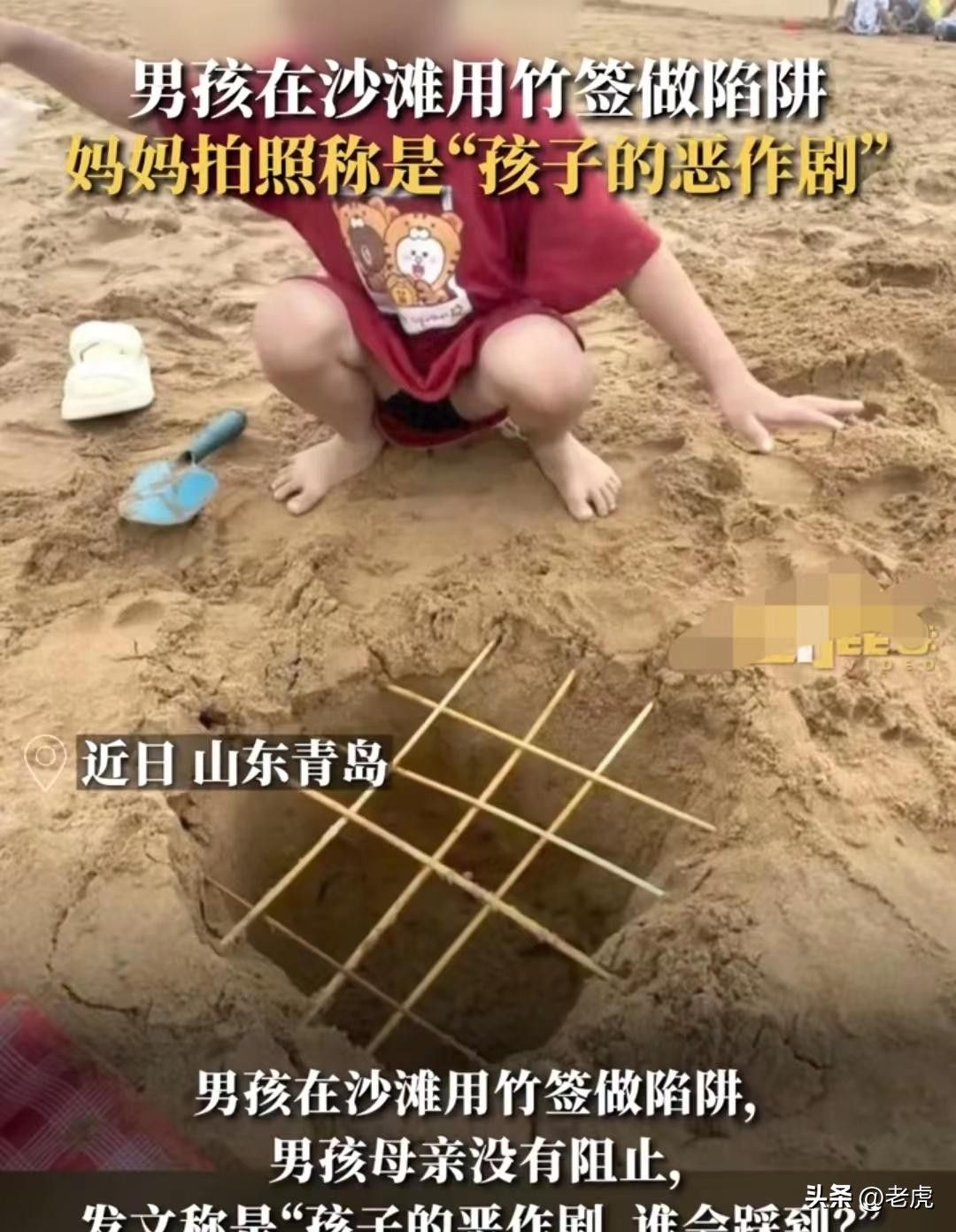 山东,青岛。男孩在沙滩上用竹签做陷阱,他妈妈不但没有阻止,还拍照发文称是孩子的恶作剧,谁会踩到呢。此视频一出,男孩妈妈的行为遭到谴责,其立马注销账号。