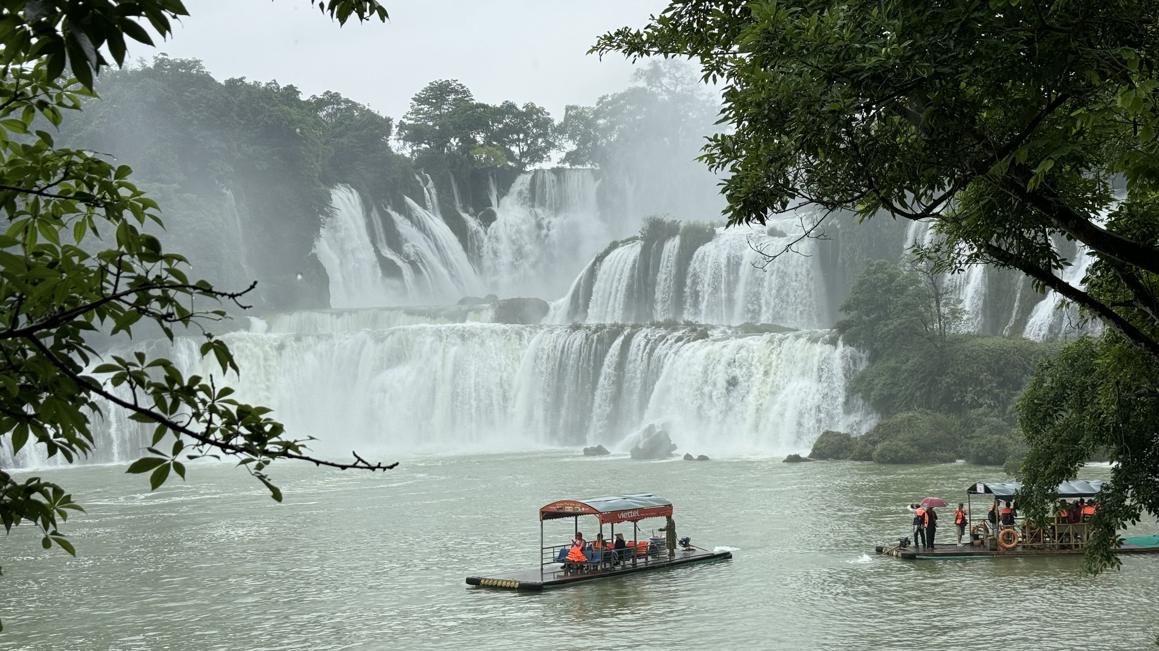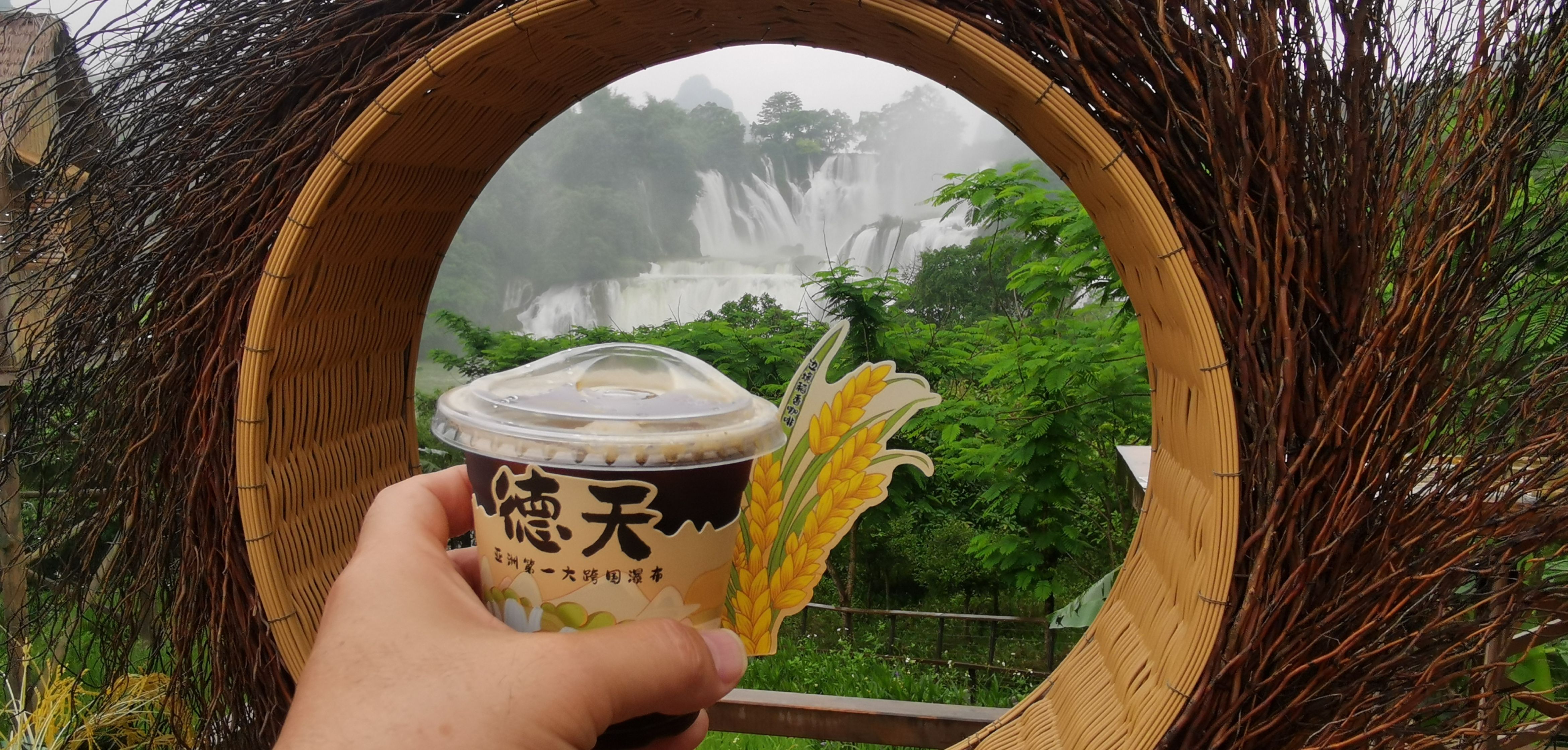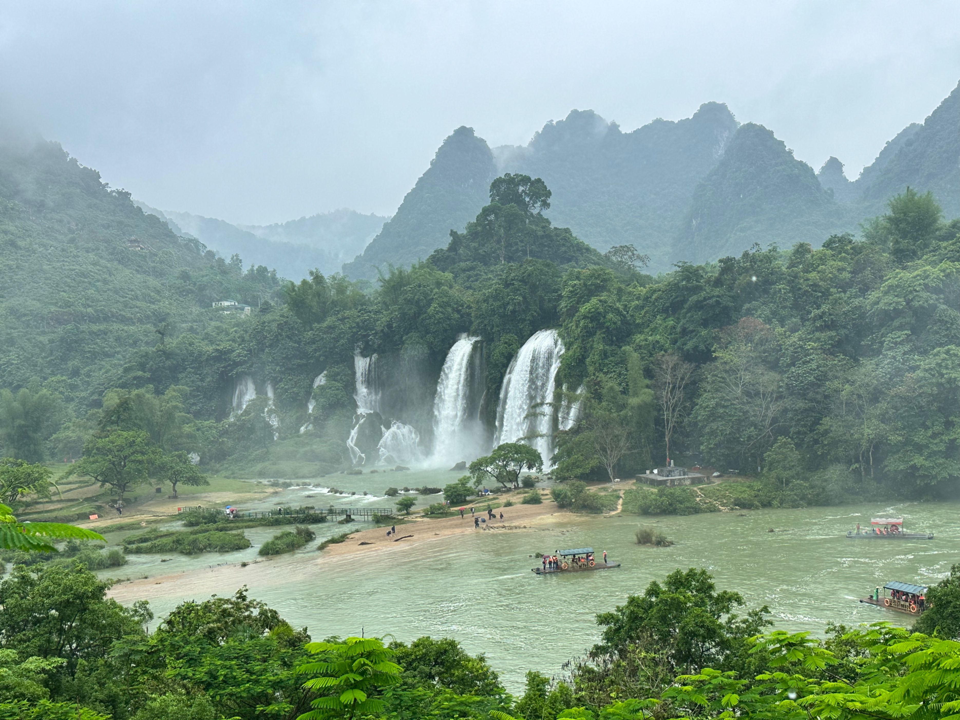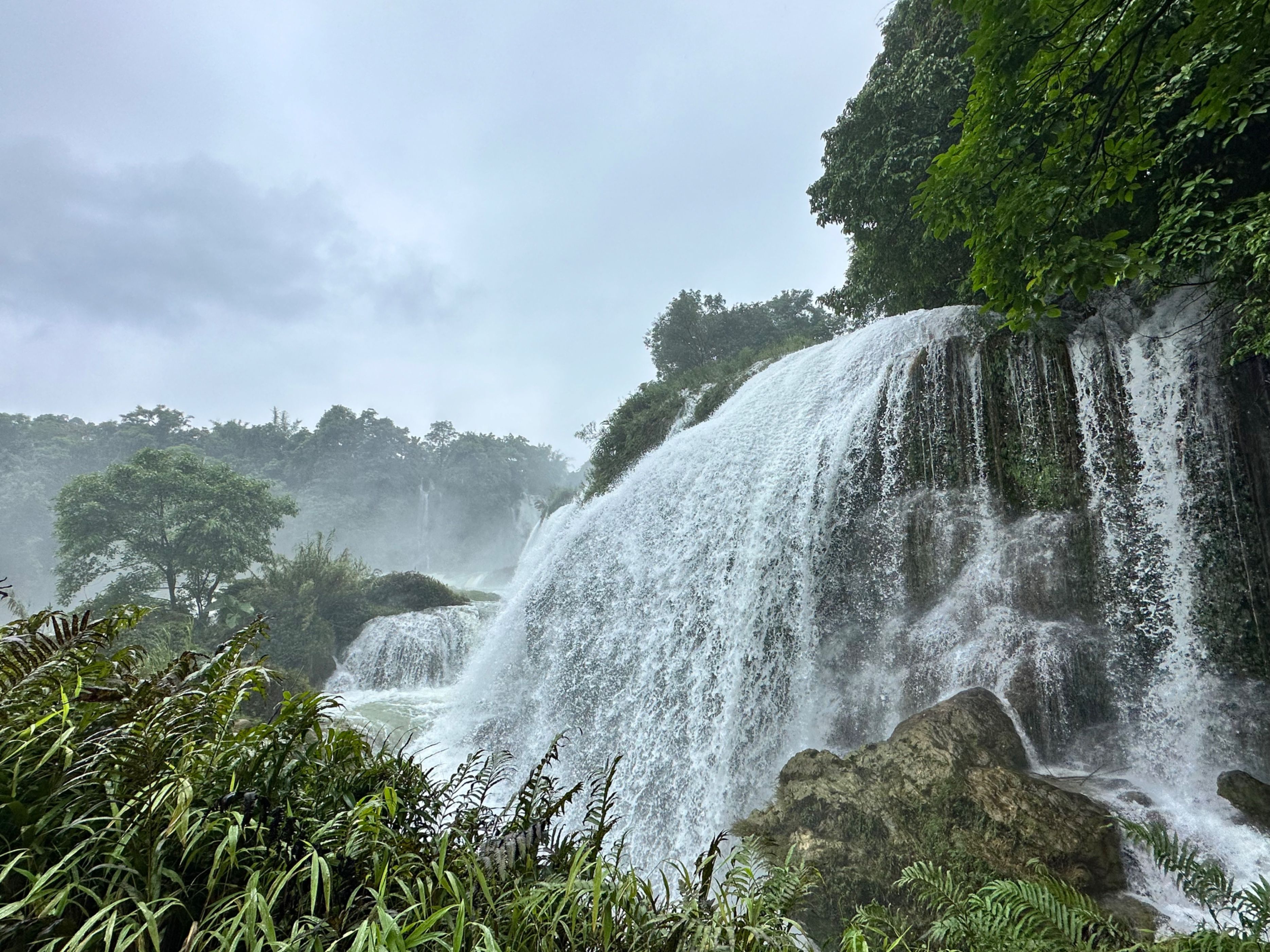德天瀑布也在硕龙镇,我们的车刚出校门,天降大雨,期待的心情瞬间变得不安,也许我们又要看见一条黄色的瀑布了。景区规划的参观路线是一条单行线,全程大约3公里,推荐游览时间约2小时。醒目位置树立着导览图,按图参观就是最好的选择。我们沿着参观路线,先到游船码头。此处距德天瀑布还有一千多米,瀑布跌落的声音却已如万马奔腾,扑面而来。透过雨幕看去,瀑布仍然是银亮的!这让我们瞬间兴奋起来。游船逐渐靠近瀑布,一片水气氤氲中,根本分不清哪个是雨,哪个是雾,哪个又是瀑布飞溅的水花。顾不上衣服湿透,鞋里养鱼,我跳上船头高喊起来,耳边却几乎听不到自己的声音,只有水声轰鸣。
